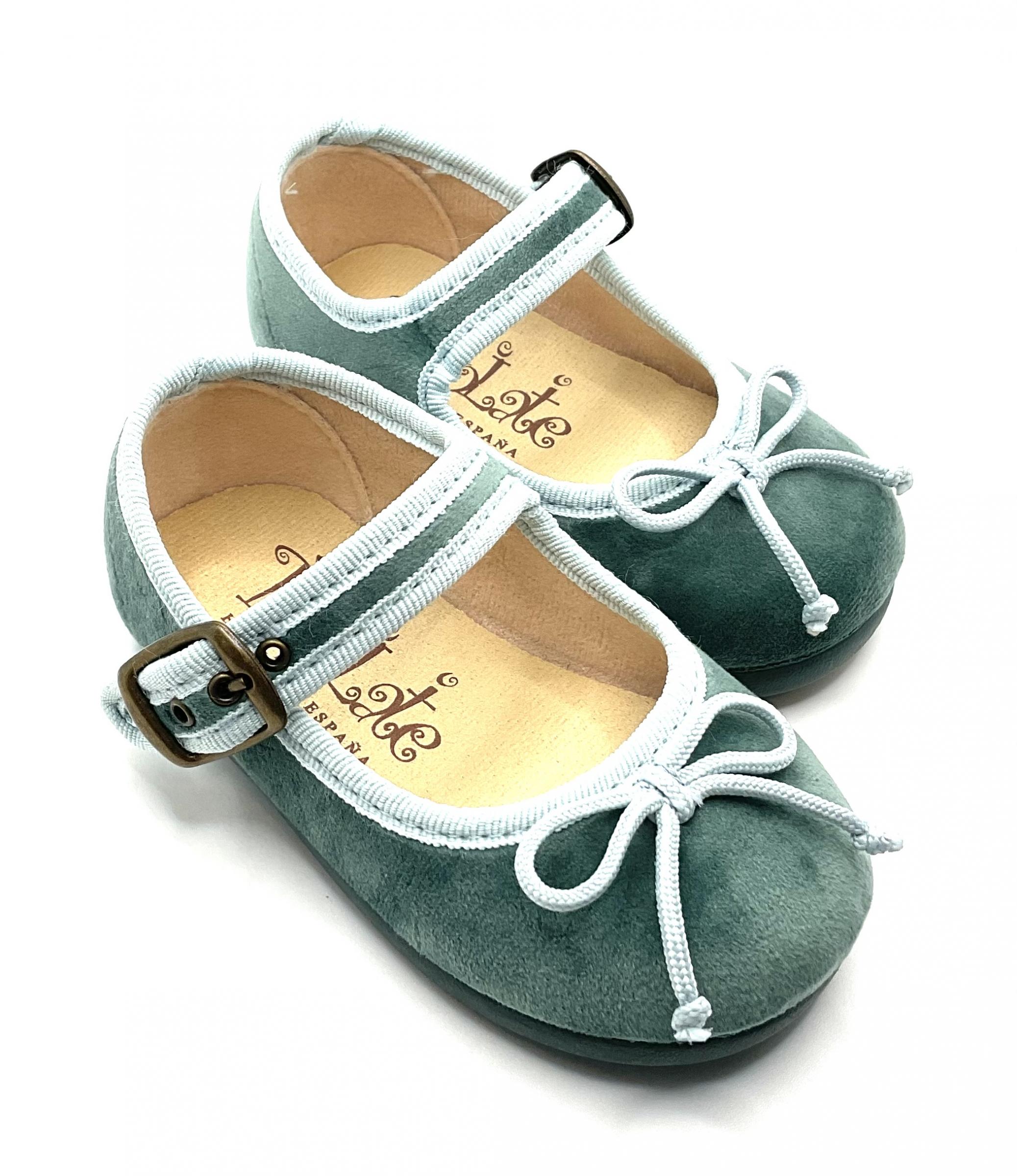Merceditas de terciopelo con vivo y lazo contraste , cierre de hebilla, ligeras y muy flexibles , con horma clásica y convencional.