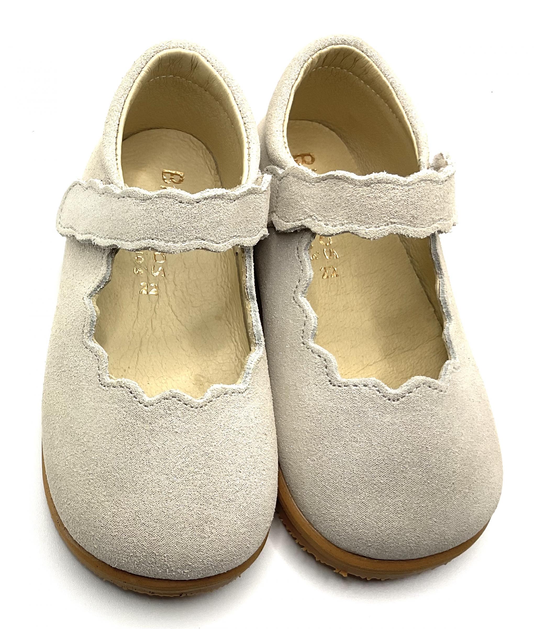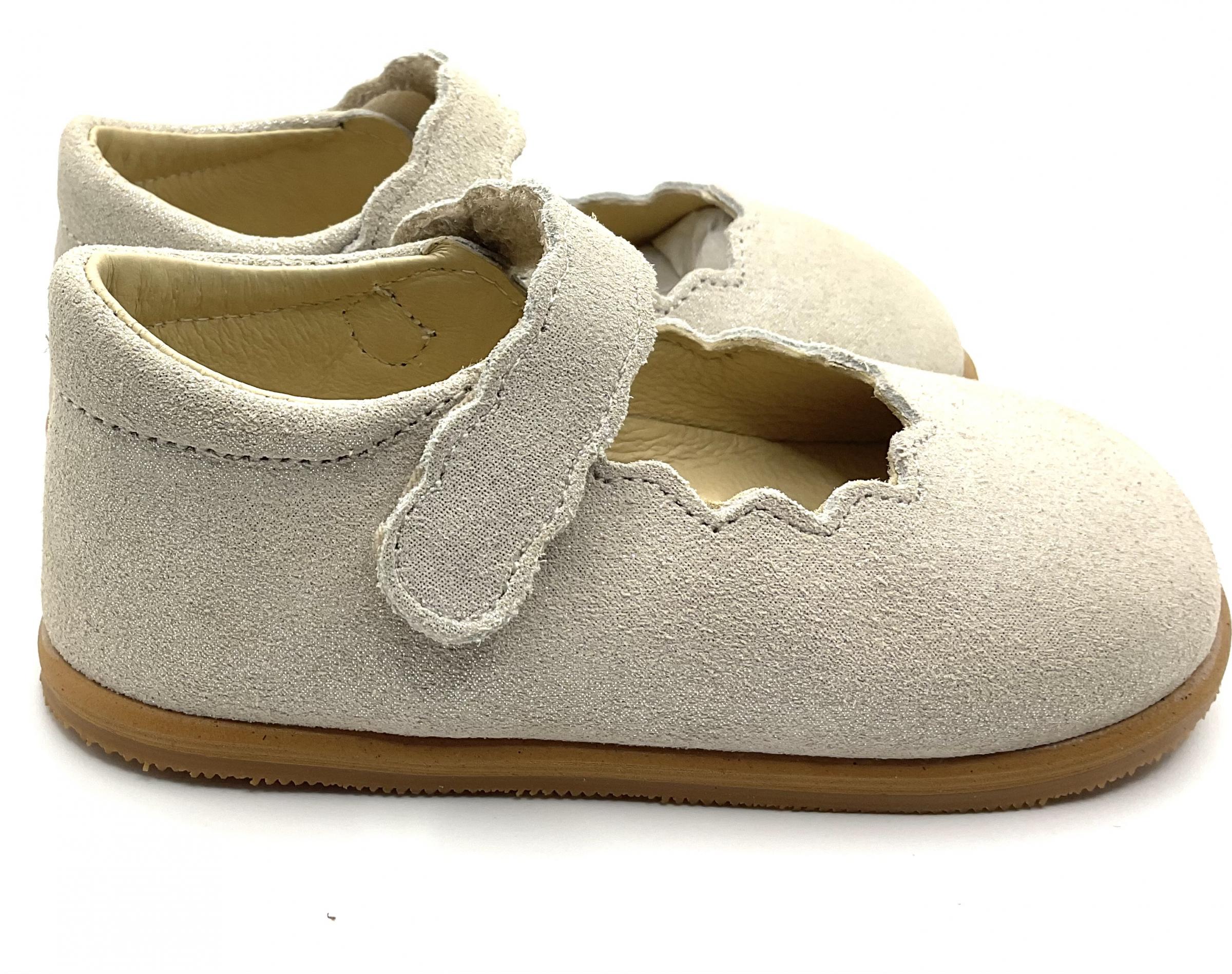 Merceditas de piel serraje metalizada oro , cierre Velcro , piso de goma , ligeras y muy flexibles , sin contrafuertes ni drop .
