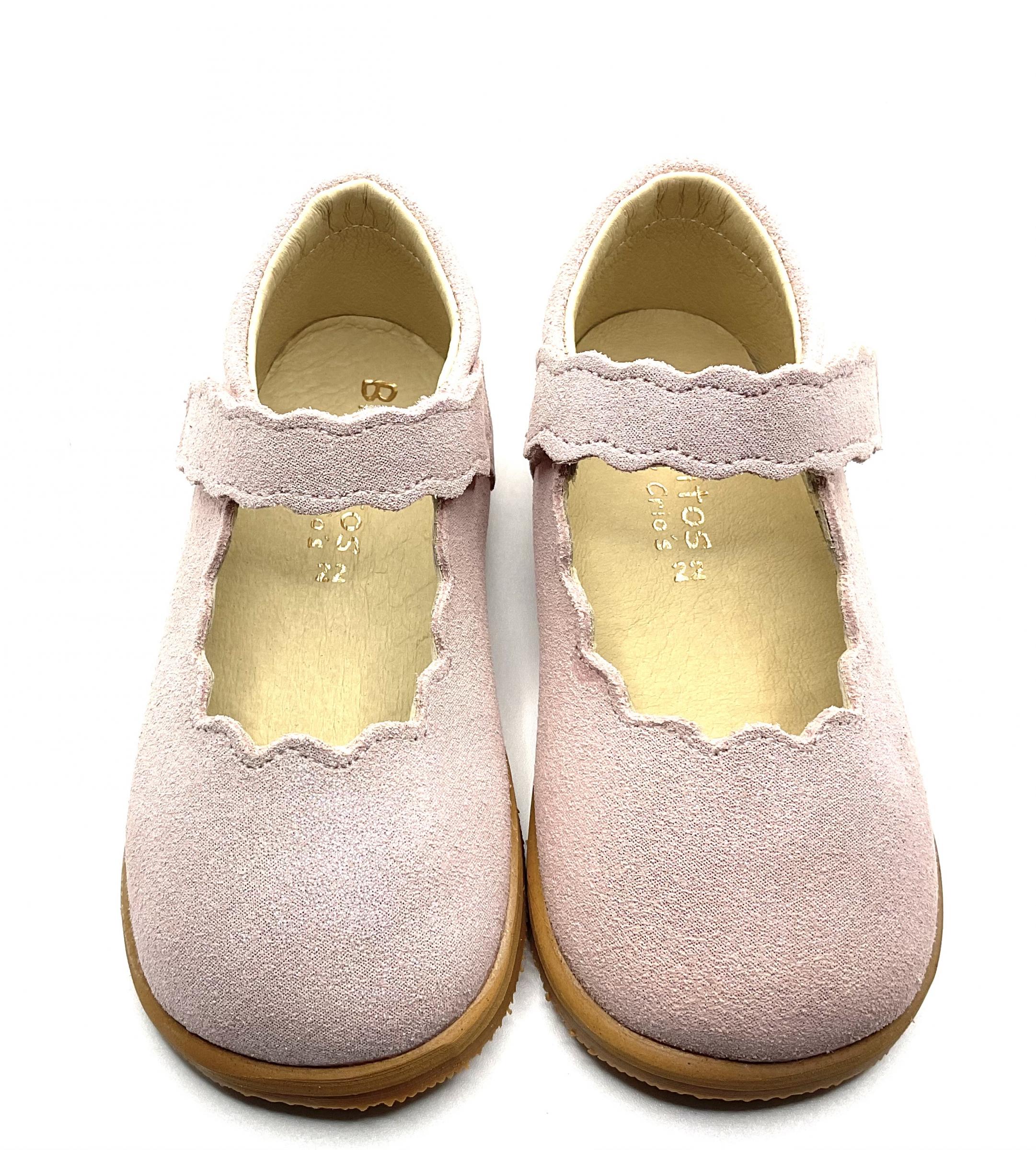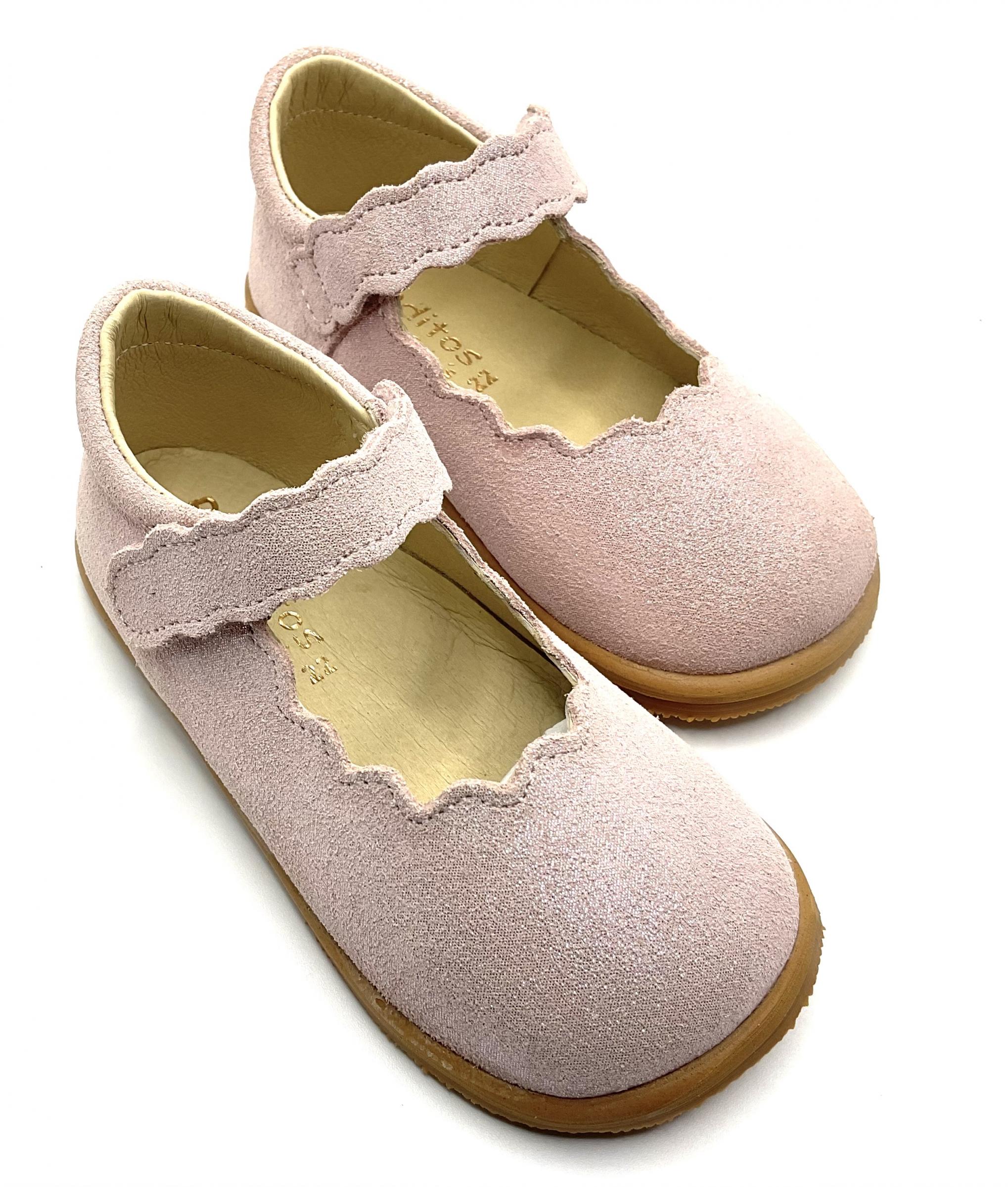 Merceditas de piel de serraje metalizada rosa , con cierre en Velcro , ligera y muy flexible, sin contrafuertes ni drop