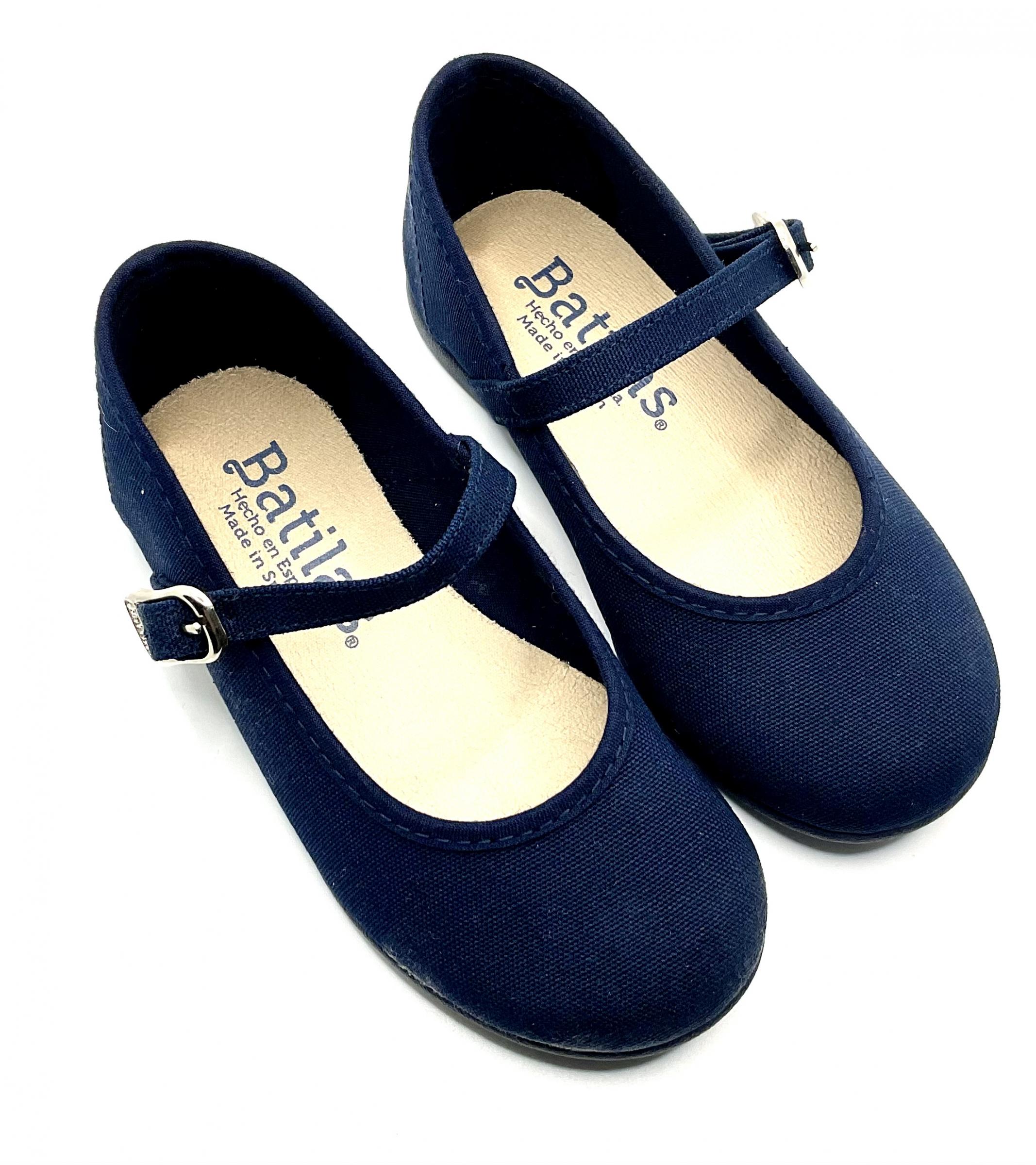 Merceditas de Batilas fabricadas en lona de algodón azul marino, horma convencional, con piso vulcanizado a tono ., ajuste con hebilla , ligeras y muy flexibles.