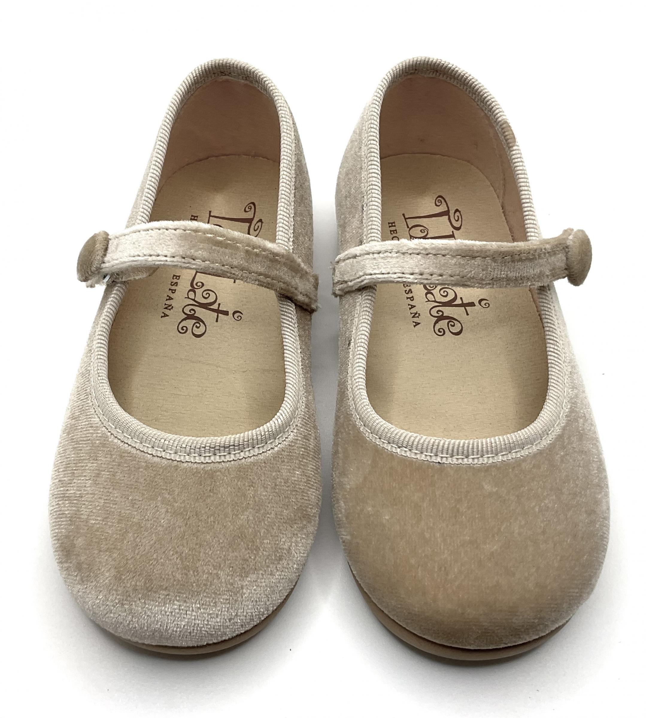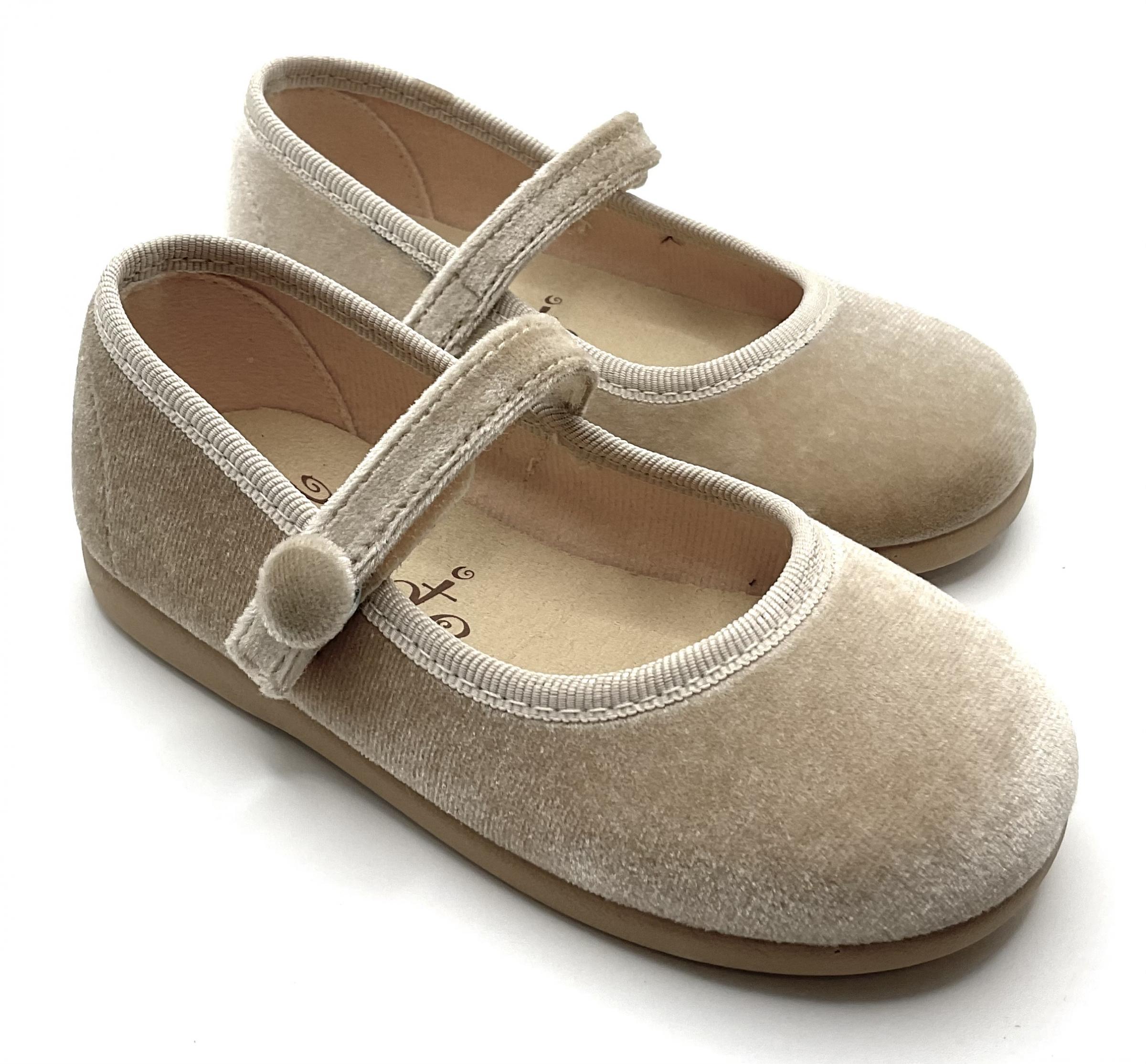 Merceditas en terciopelo de color beigs, con cierre de velcro y botón forrado de adorno. Ligeras y muy flexibles con una línea clásica