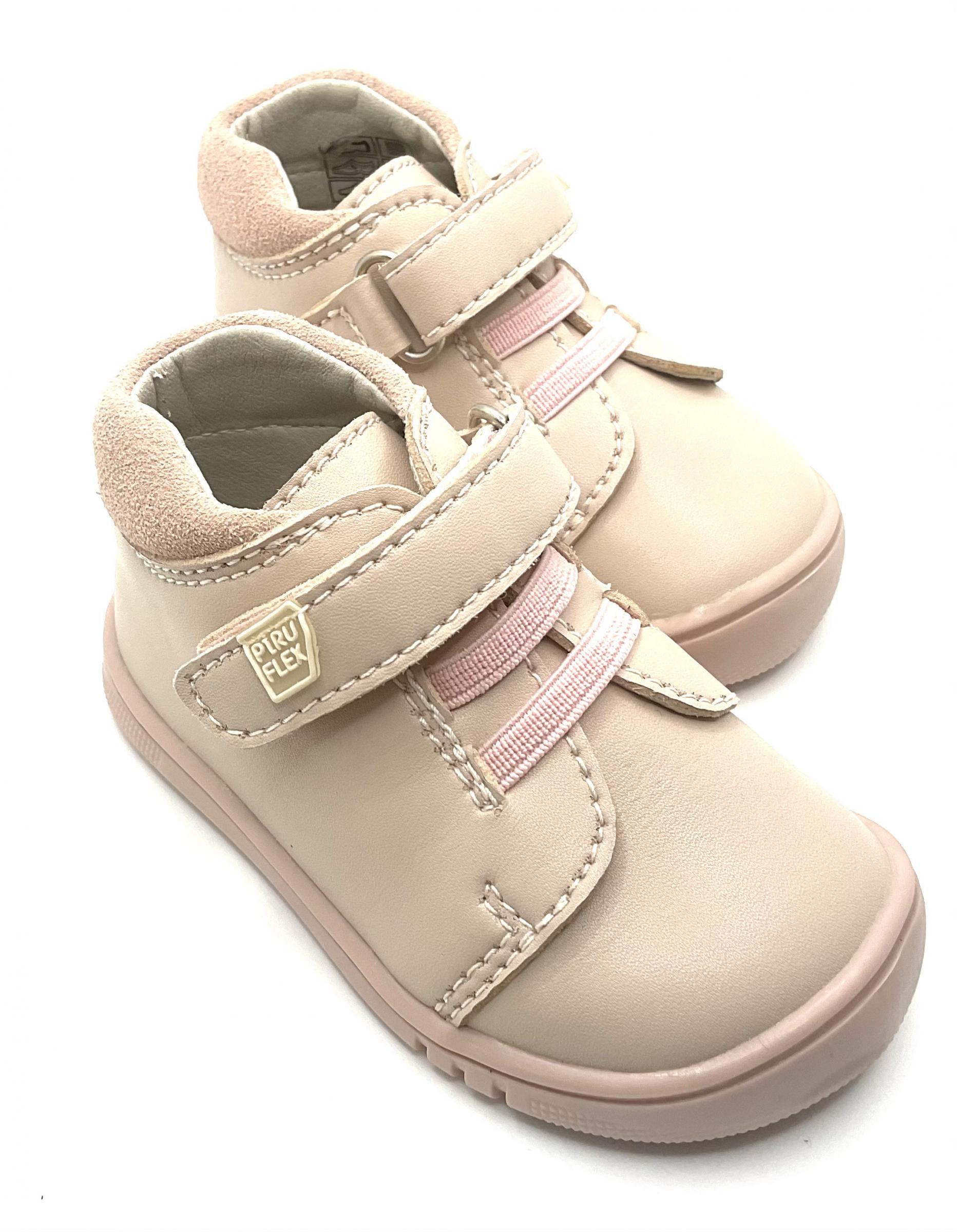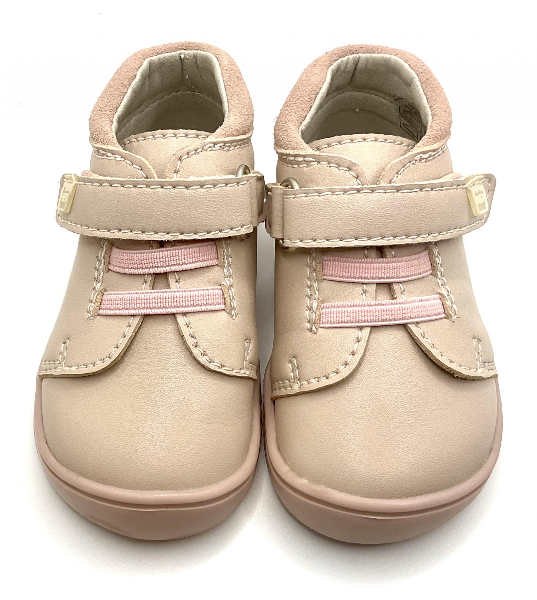 Botitas de piel en color Nude, con ajuste de velcro y cordones elásticos, horma 100 × 100 respetuosa, sin contrafuertes y sin Drop, ligeras y muy flexibles y con plantilla extraíble