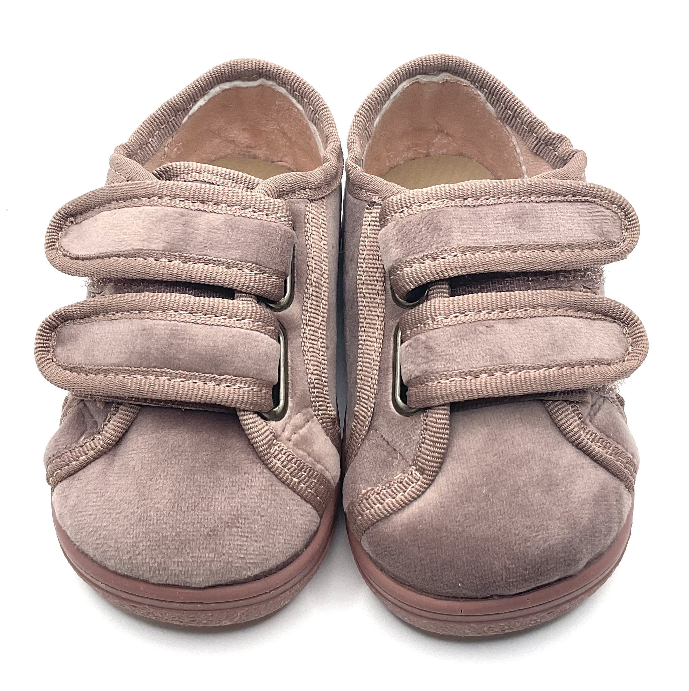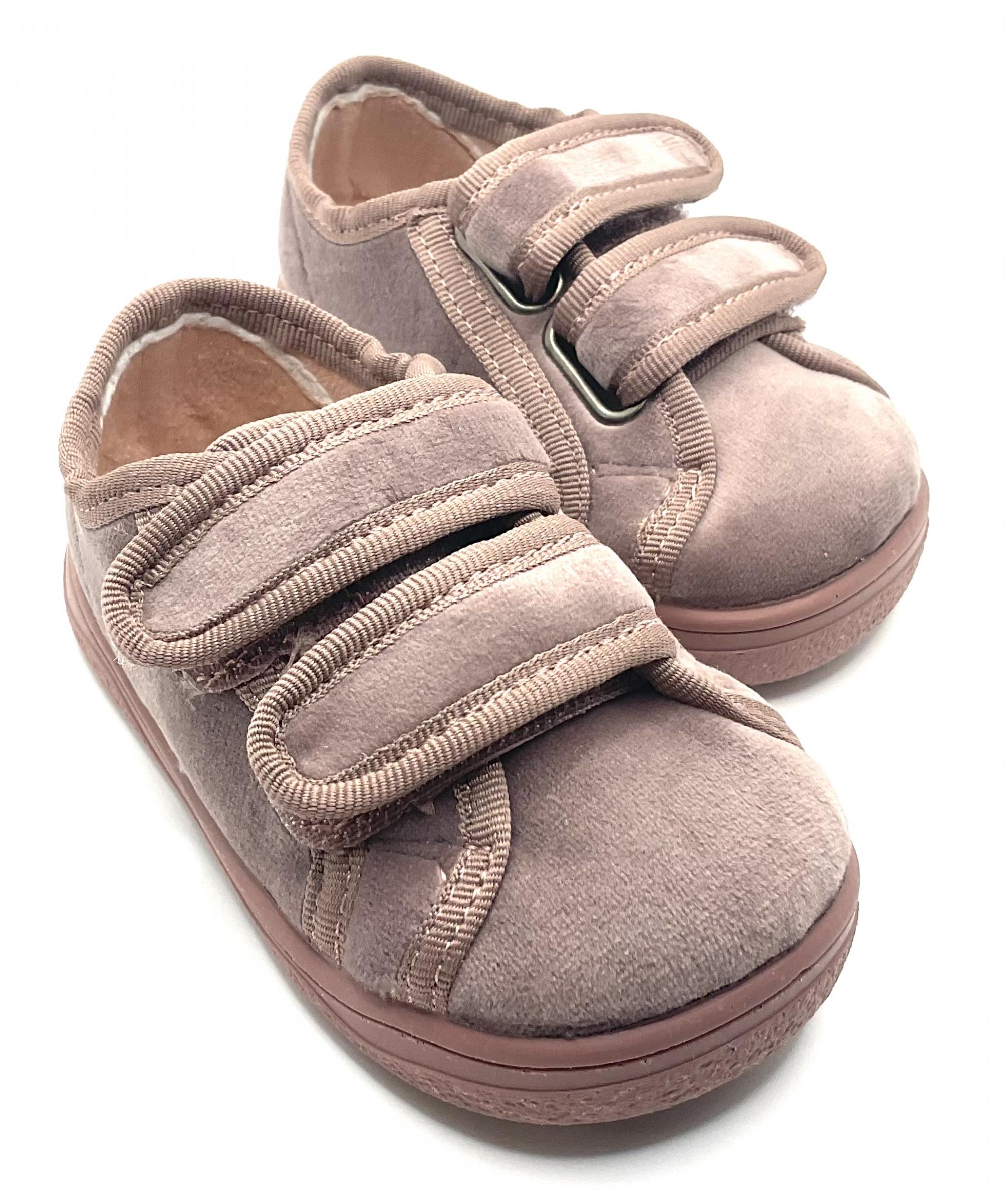 Zapatito de doble velcro, confeccionado en terciopelo, horma respetuosa, sin ningún tipo de contrafuerte, ligero y flexible, cero Drop y plantilla extraíble