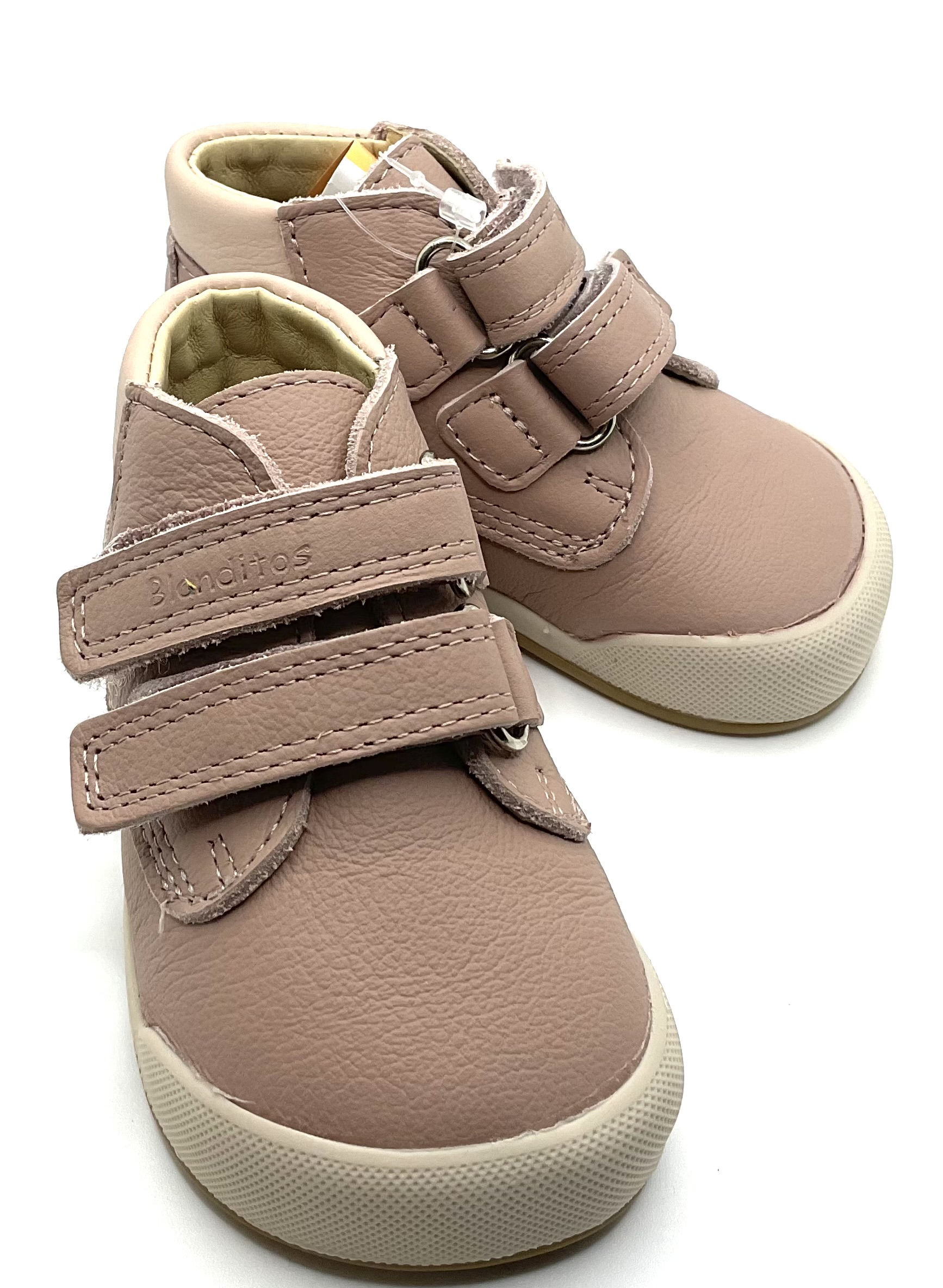 Botitas de piel rosa, con cierre de doble velcro, completamente respetuosa, ligera, muy flexible, sin contrafuertes y libre de Drop.