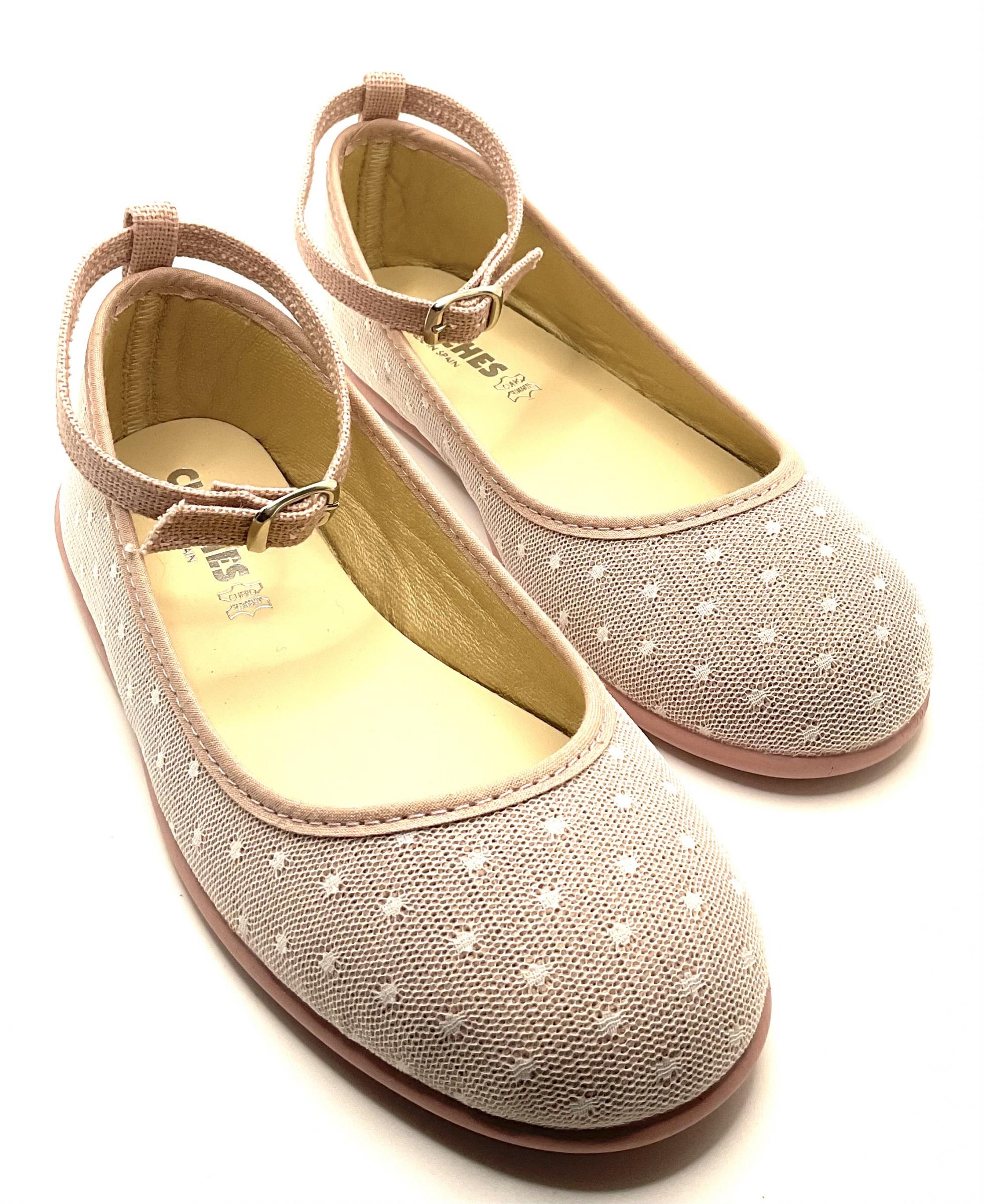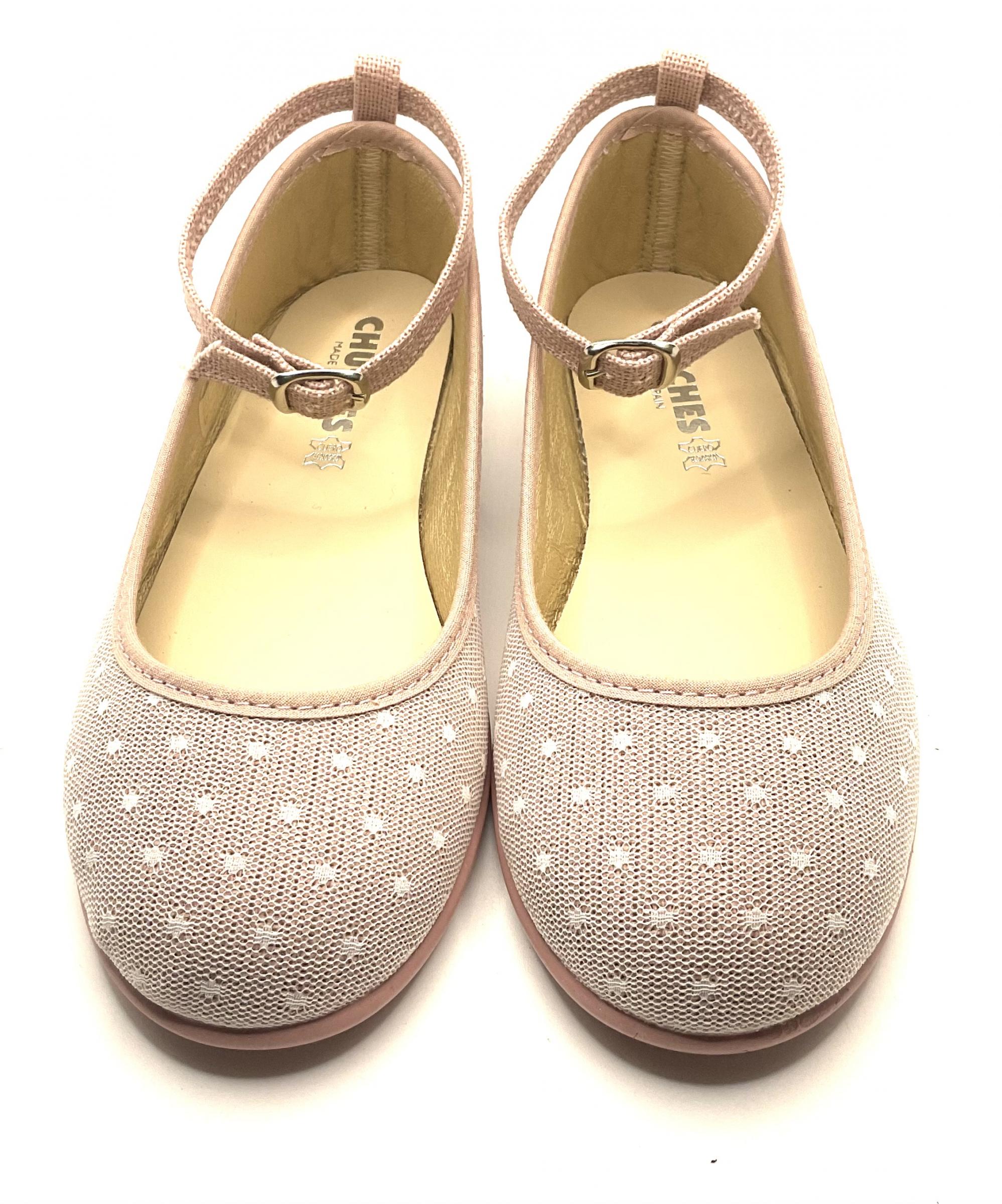 Manoletina atada al tobillo mediante correa con hebilla, fabricada en plumrti rosa palo , piso de goma , lavable , muy ligera y flexible. Ideal para primeras comuniones .