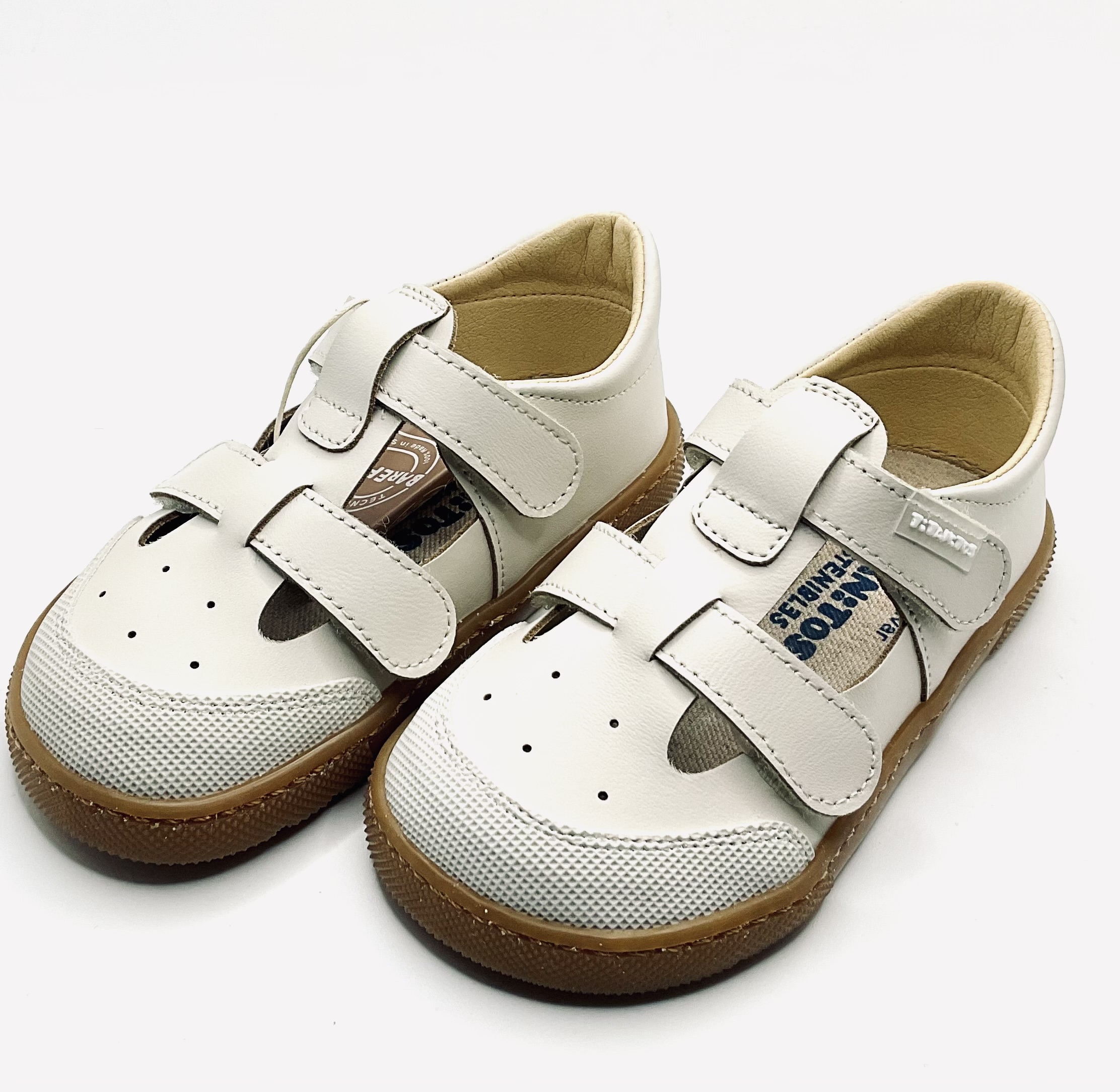 Sandalia de la marca Titanitos fabricada en piel lavable de color hielo, Con horma respetuosa y Barefoot, Con ajustes de doble Velcro, Piso de goma Inyectado y cosido en tono marrón antideslizante, No tiene contrafuertes ,no tiene Drop ,es muy flexible en el metatarsiano ,tiene la plantilla extraíble y lo mejor de todo es que se puede lavar en lavadora.