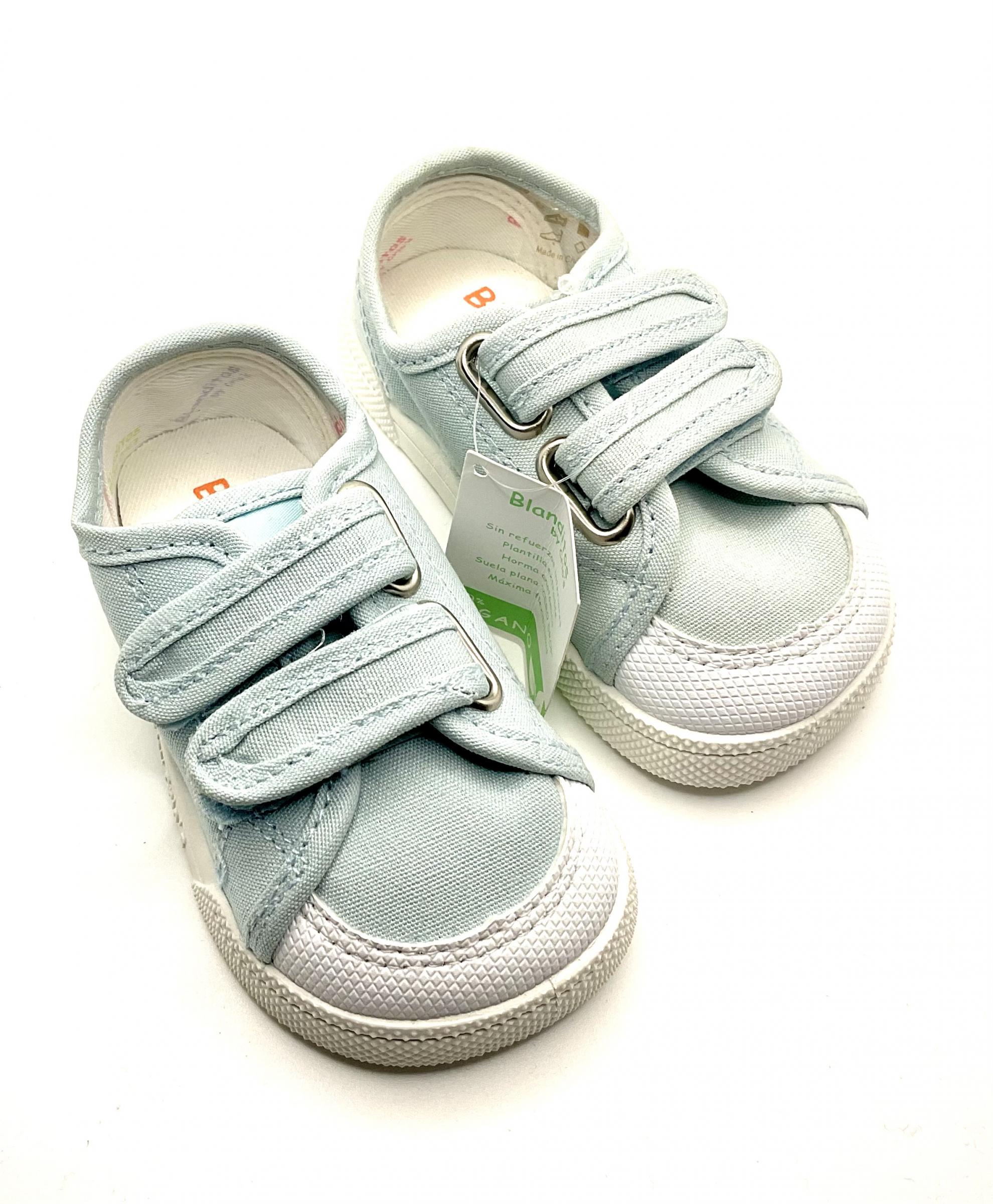 Zapatillas de lona, de color celeste, fabricadas por blanditos con horma respetuosa y Barefoot. ajuste con doble velcro, puntera reforzada, plantilla antideslizante, sin contrafuertes ,con cero Drop, muy flexibles en el metatarsiano.