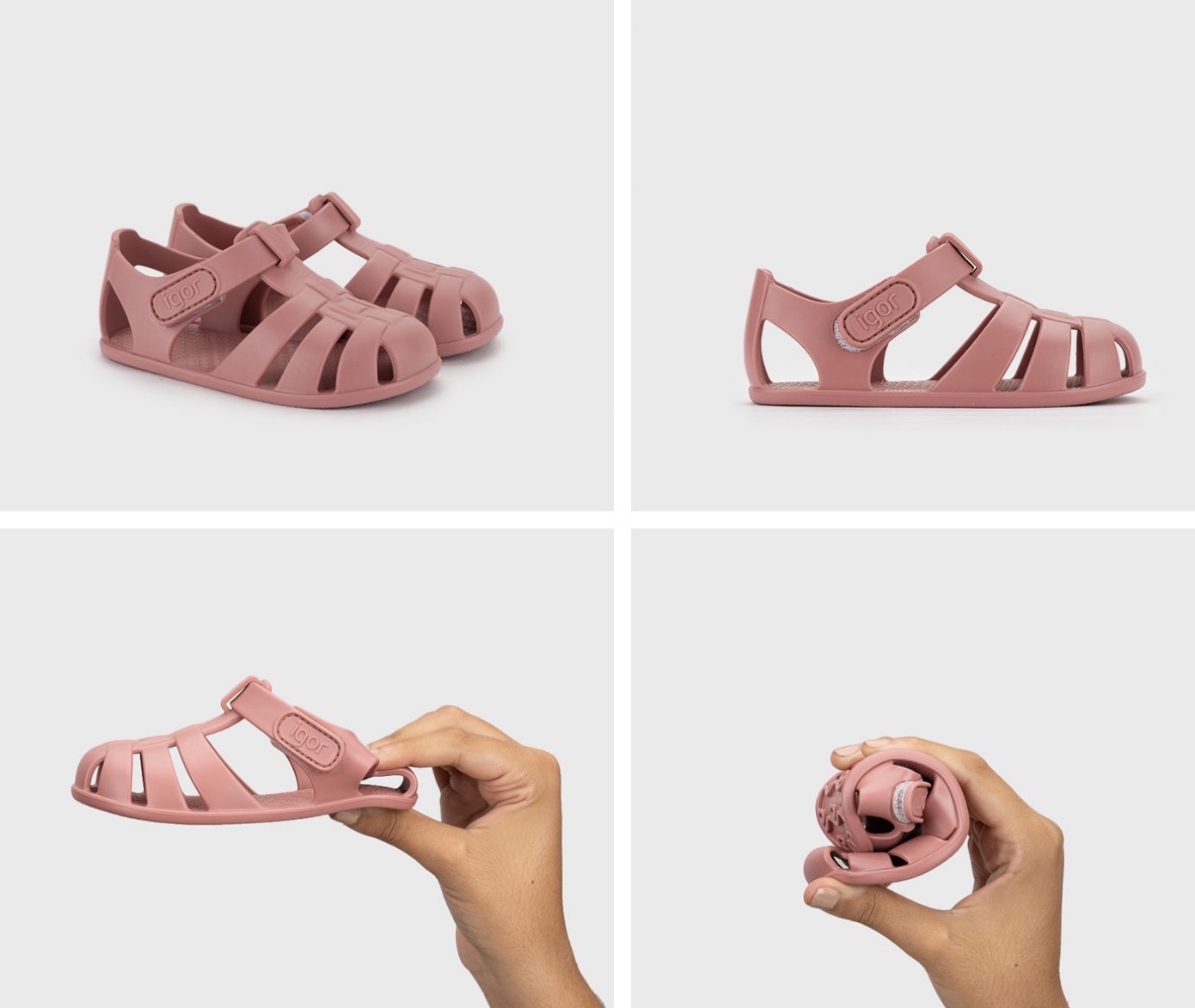 Cangrejera diseñada en concepto barefoot medium, cero drop, flexible y blandita, fabricada con al menos un 50% de pvc reciclado libre de ftalatos y cierre adherente.