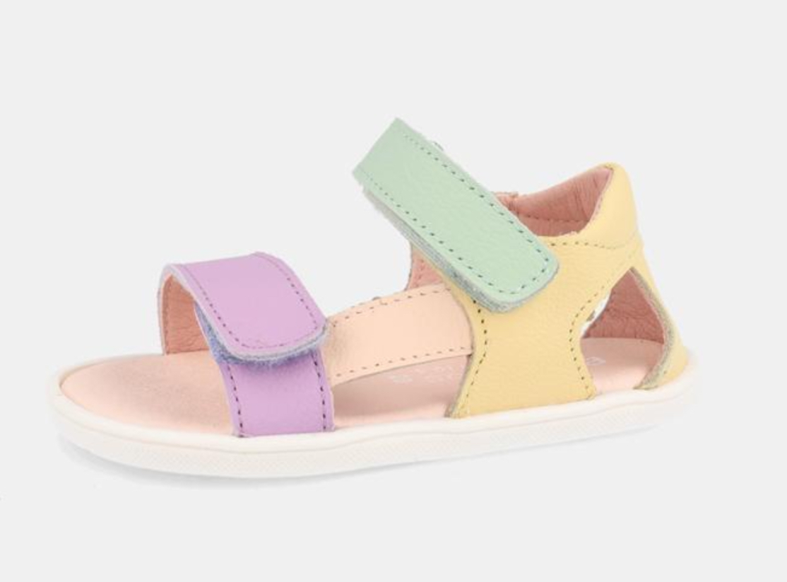Sandalia de la marca Blanditos con horma completamente respetuosa, fabricada en piel, con una bonita combinación de colores en tonos malvas, verdes y amarillos.