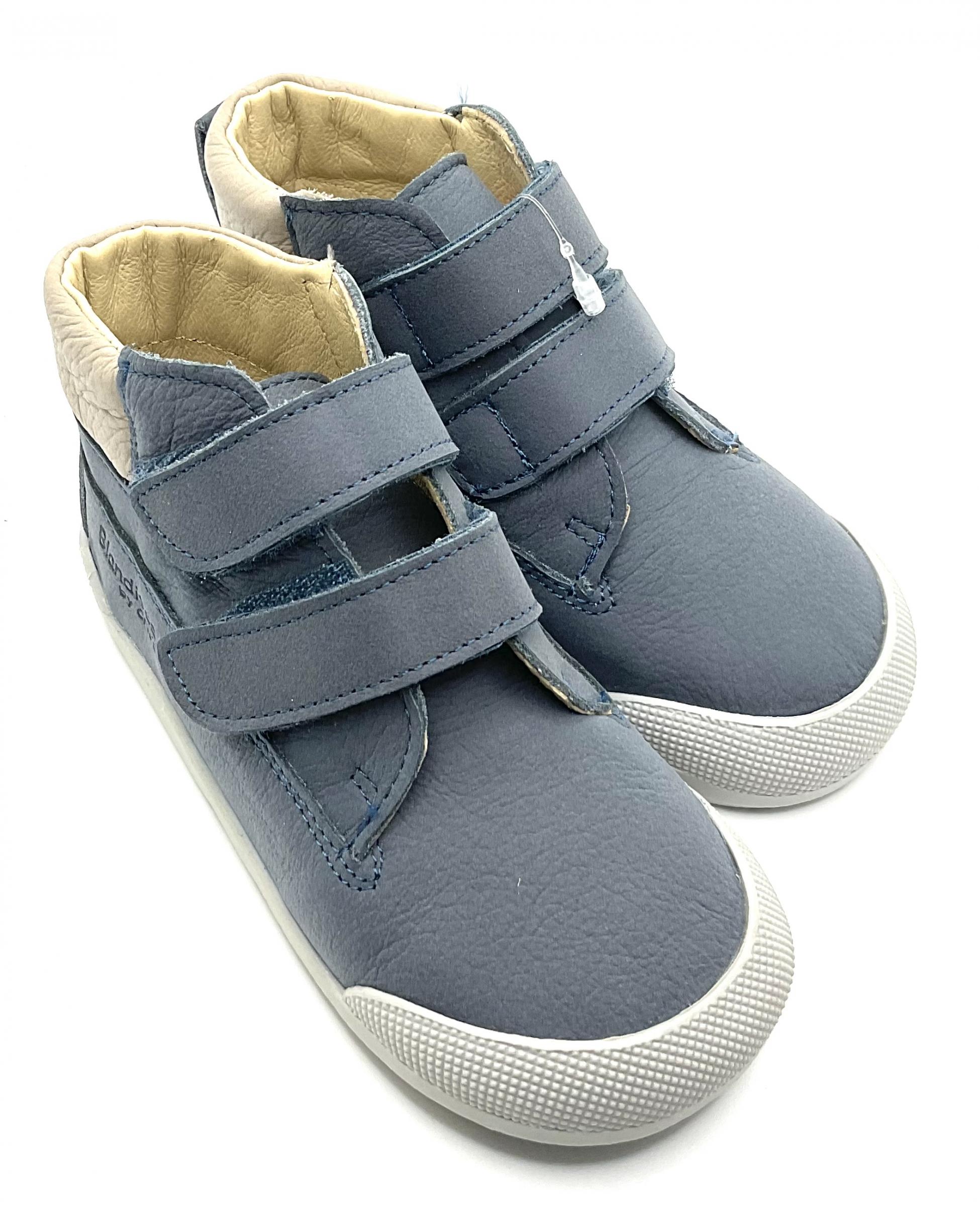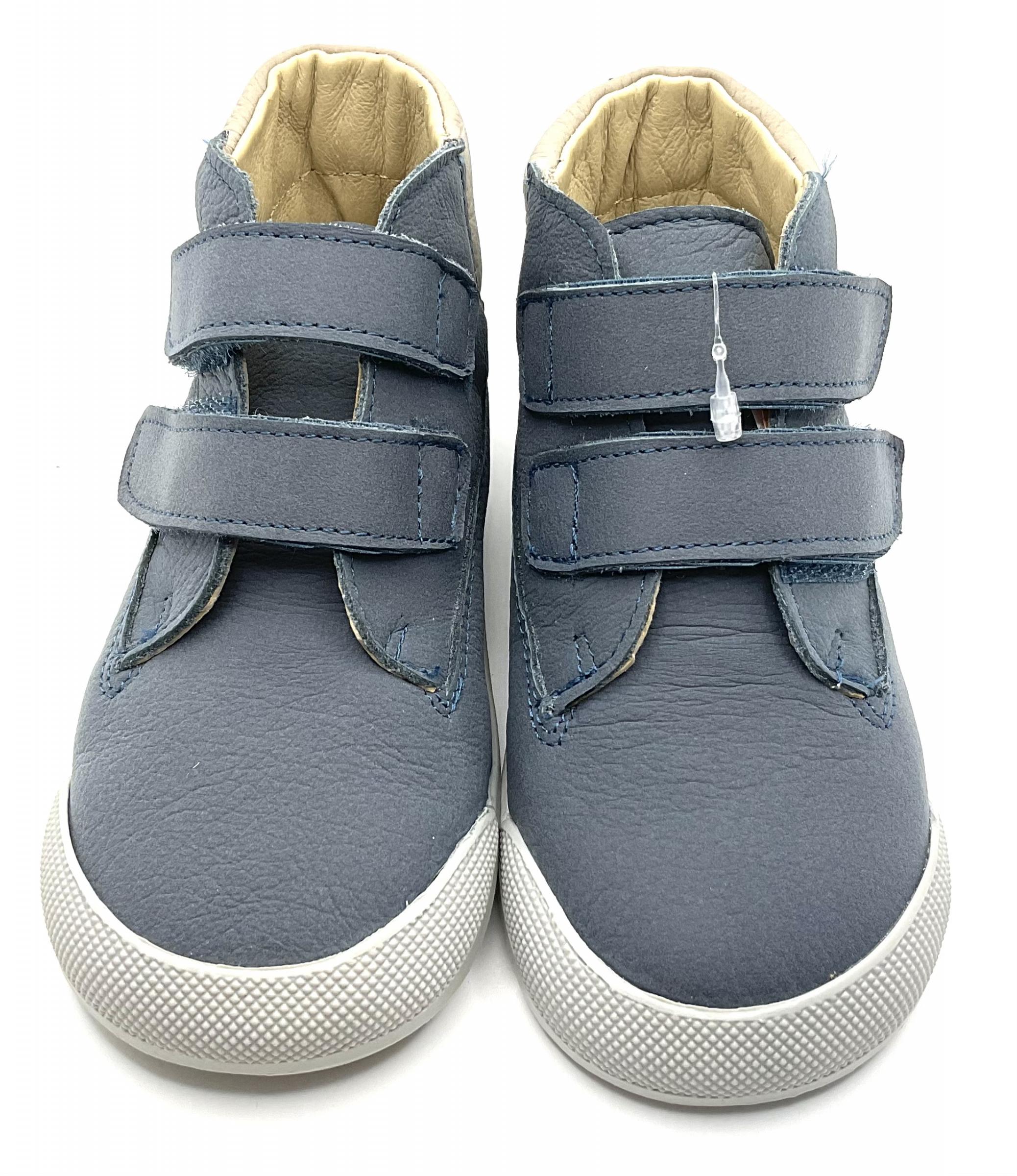 Botita de piel en color azul Navi de la marca blandito, horma completamente respetuosa, ligera y flexible, sin contrafuertes, sin Drop, y con plantilla extraíble, ajuste con doble Velcro.