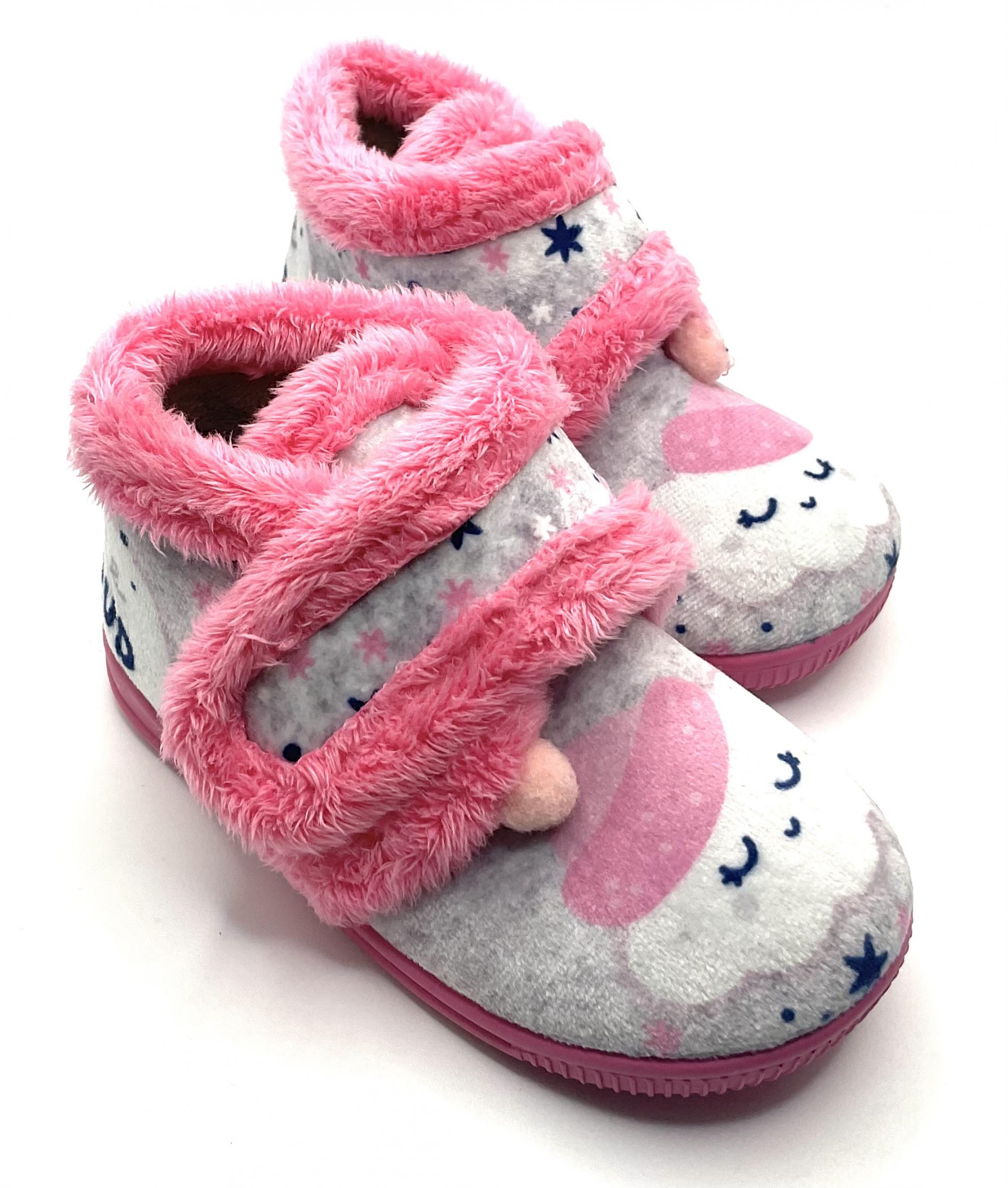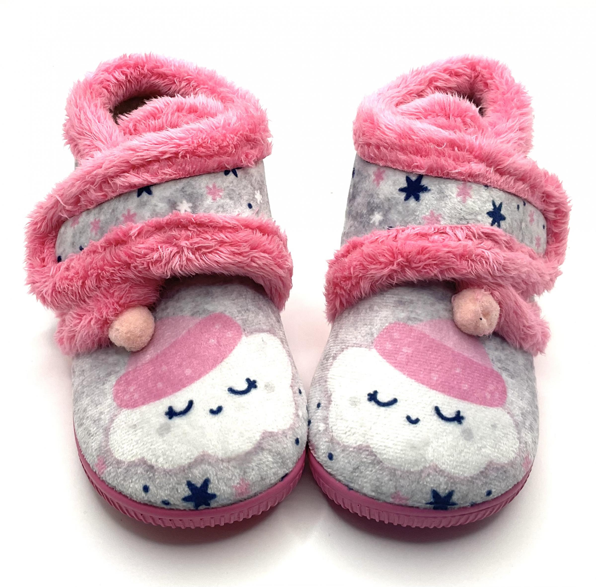 Zapatillas de estar por casa en tono gris y rosa, con motivos de nubes, ligeras y muy flexibles, cierre con velcro, libre de contrafuertes, en su interior y de costuras.
