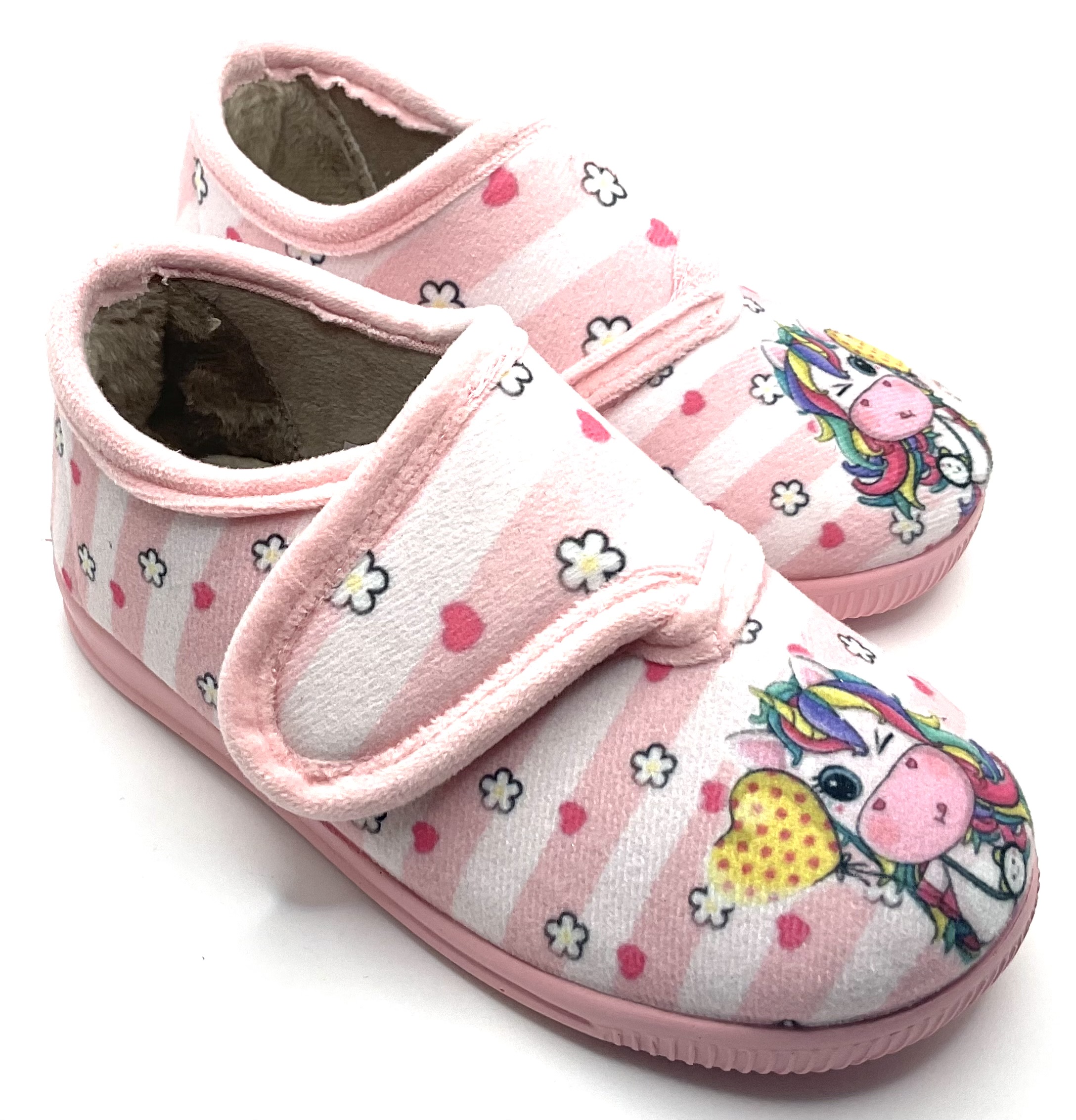 Zapatillas de estar por casa con cierre de Velcro, en rosa y blanca, con motivos de florecitas y pony, Ligeras y flexibles, sin contrafuertes, ni costuras en su interior.