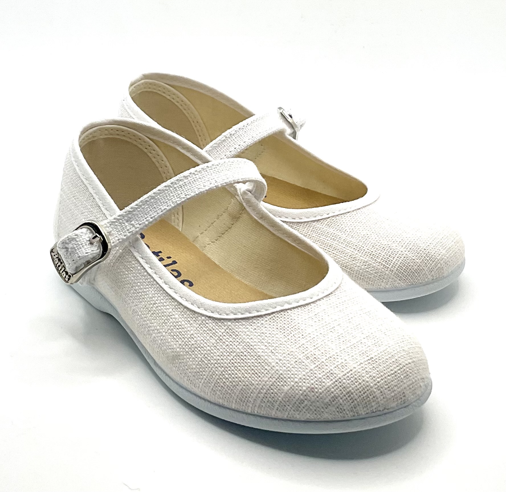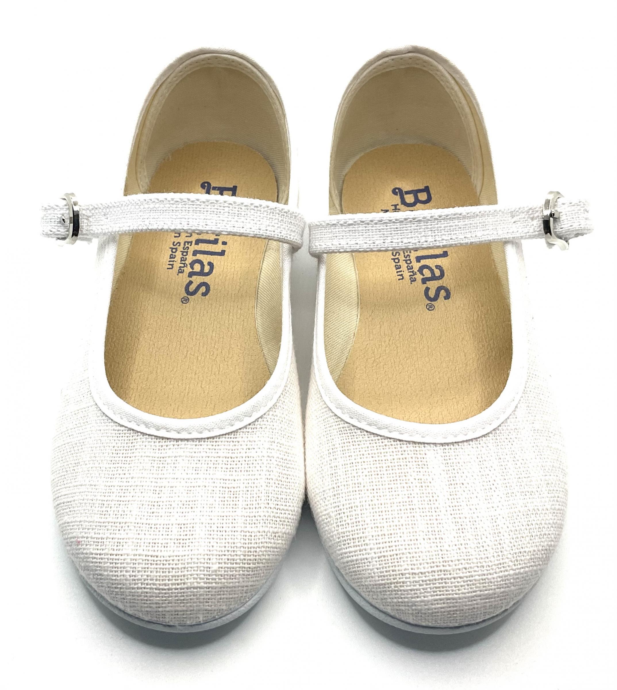 Merceditas de hilo blanco con ajuste de hebilla, piso de goma blanca vulcanizado con lo cual hace que la zapato sea muy ligero, flexible y además pueda lavarse en lavadora.