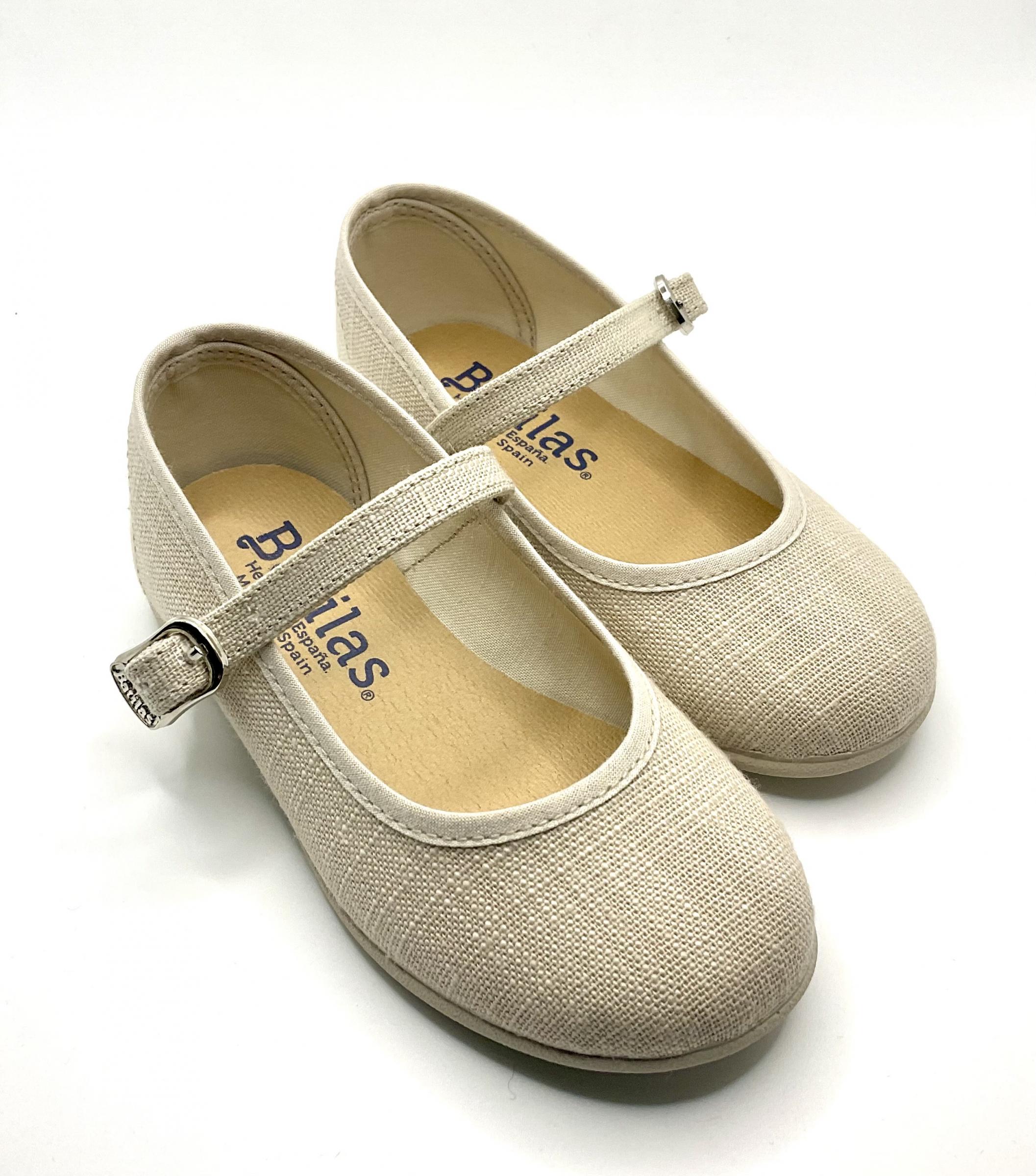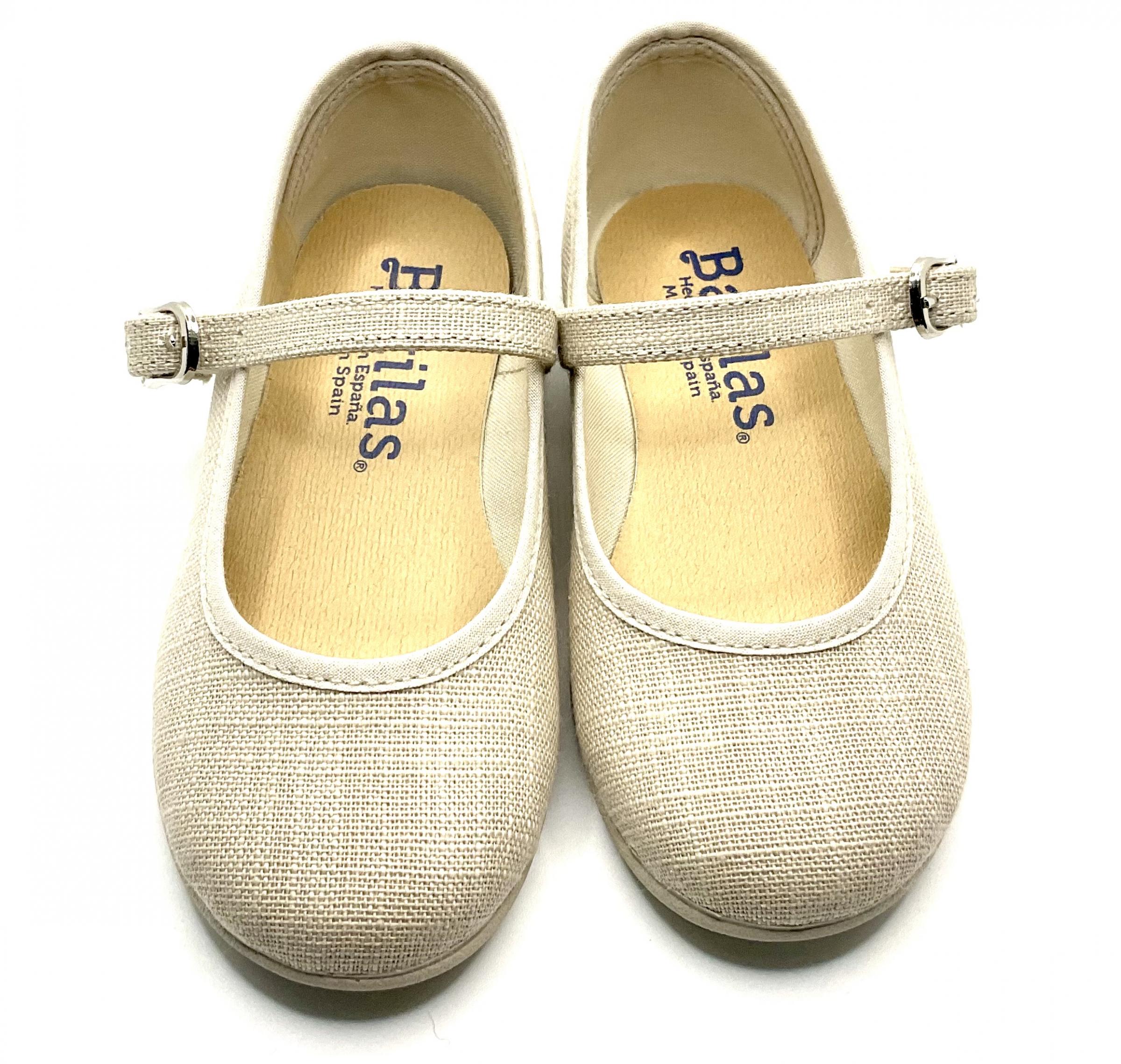 Merceditas de hilo piedra y cierre de hebilla , con piso de goma vulcanizada , lo que hace que el zapato sea muy ligero, muy flexible, y además se pueda lavar en lavadora.