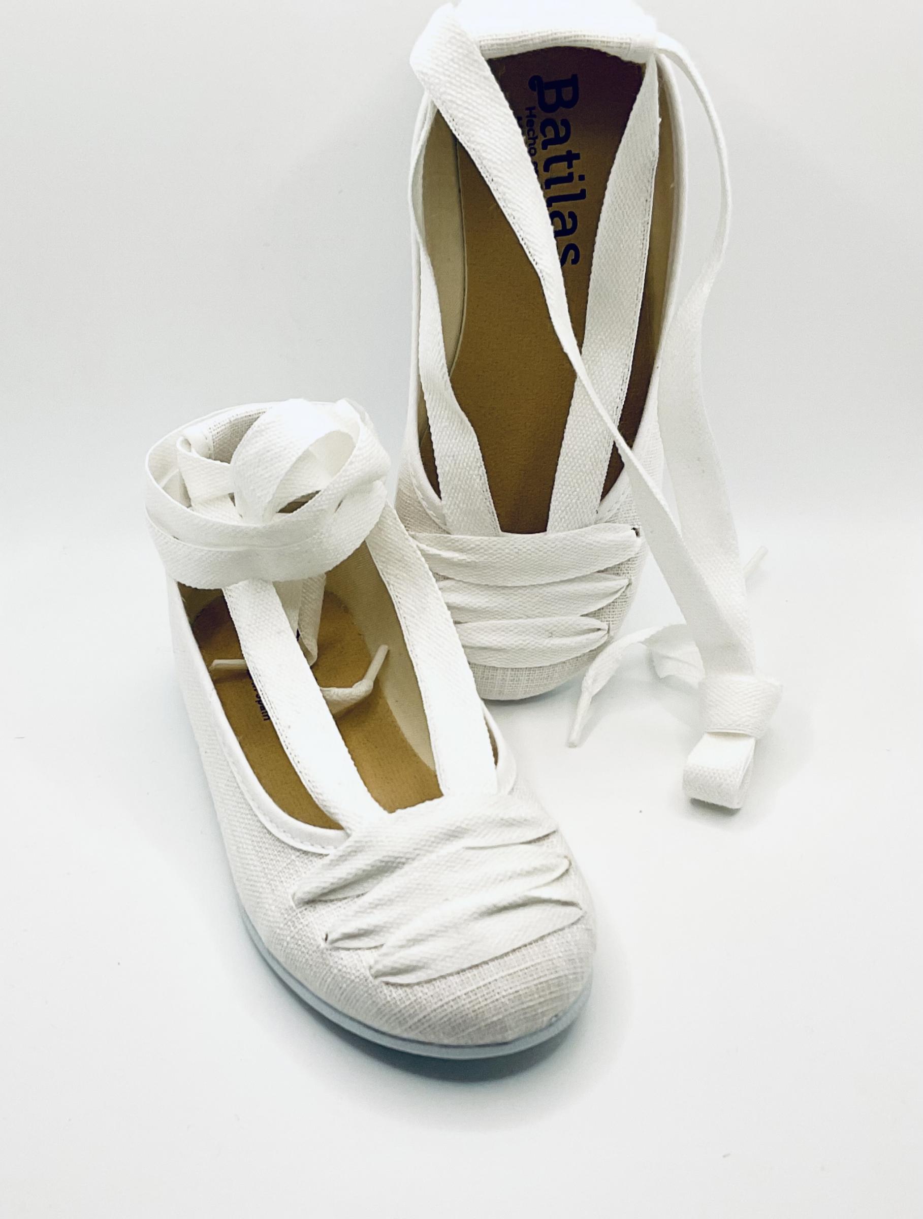 Manoletinas blancas, fabricadas en lino blanco, con cintas de algodón cruzadas al tobillo al estilo romano, con piso de goma al tono, son muy ligeras y muy flexibles.