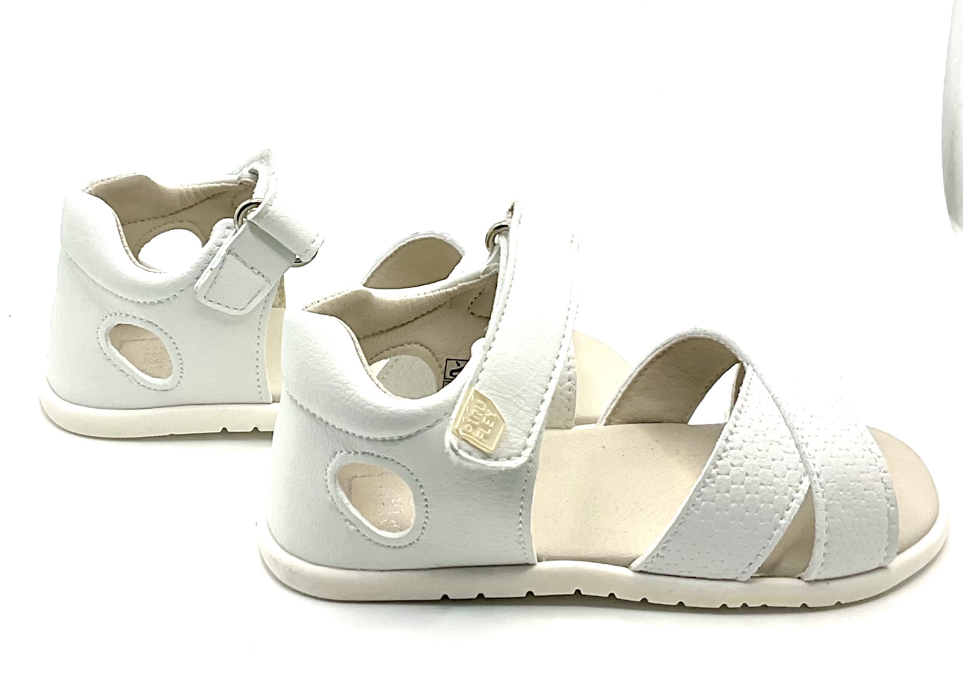 Sandalia respetuosa y Barefoot de la marca piruflex fabricada en una piel muy suave de tono blanco, con talonera cerrada, pero sin contrafuertes, súper flexible, ideal para pies anchitos .