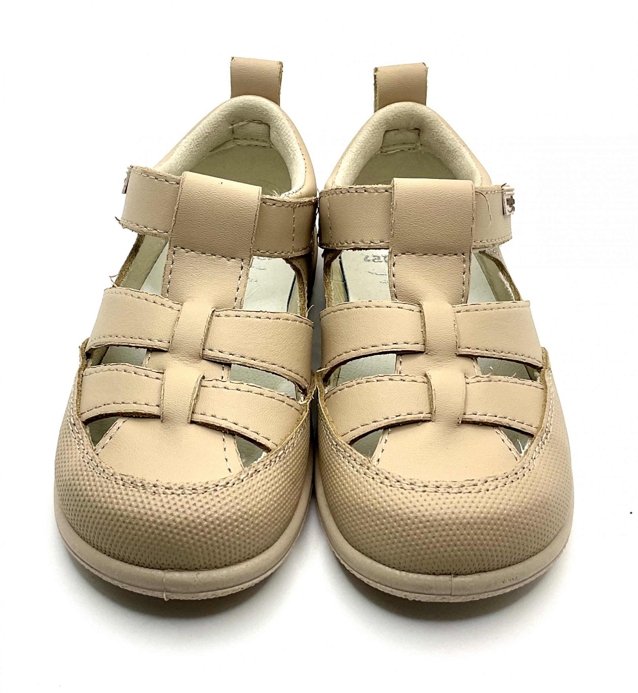 Sandalia tipo cangrejera, fabricada en piel de color Camel por Zappy, horma completamente respetuosa con puntas reforzada, muy ligeras , muy flexibles y con plantillas extraíble ,ajusta con velcro.