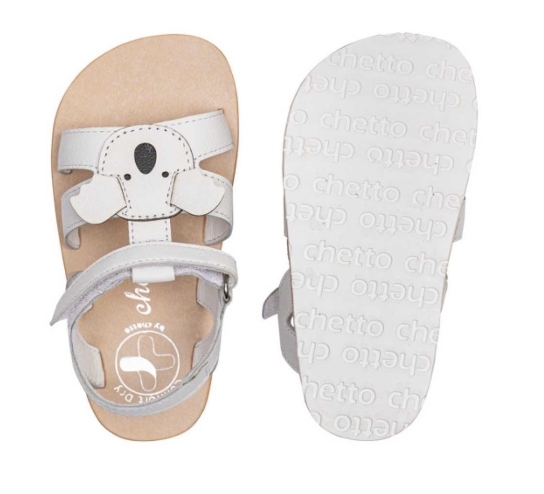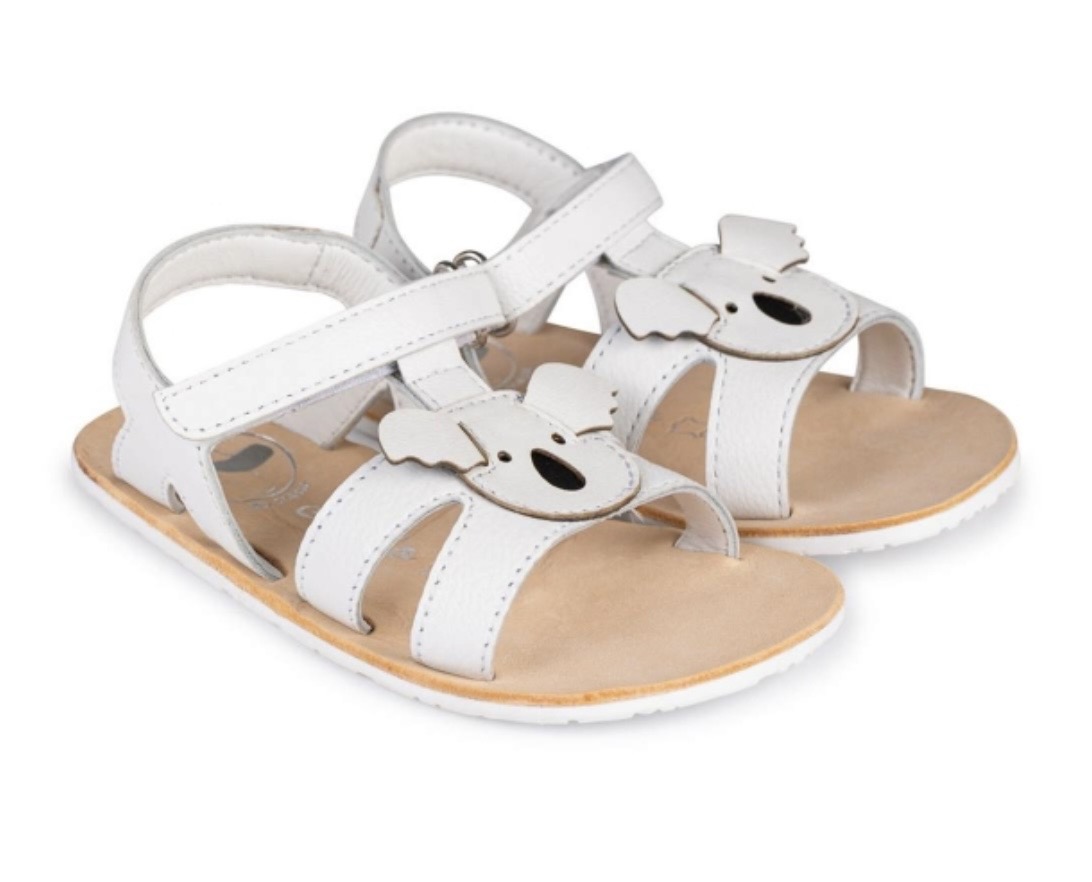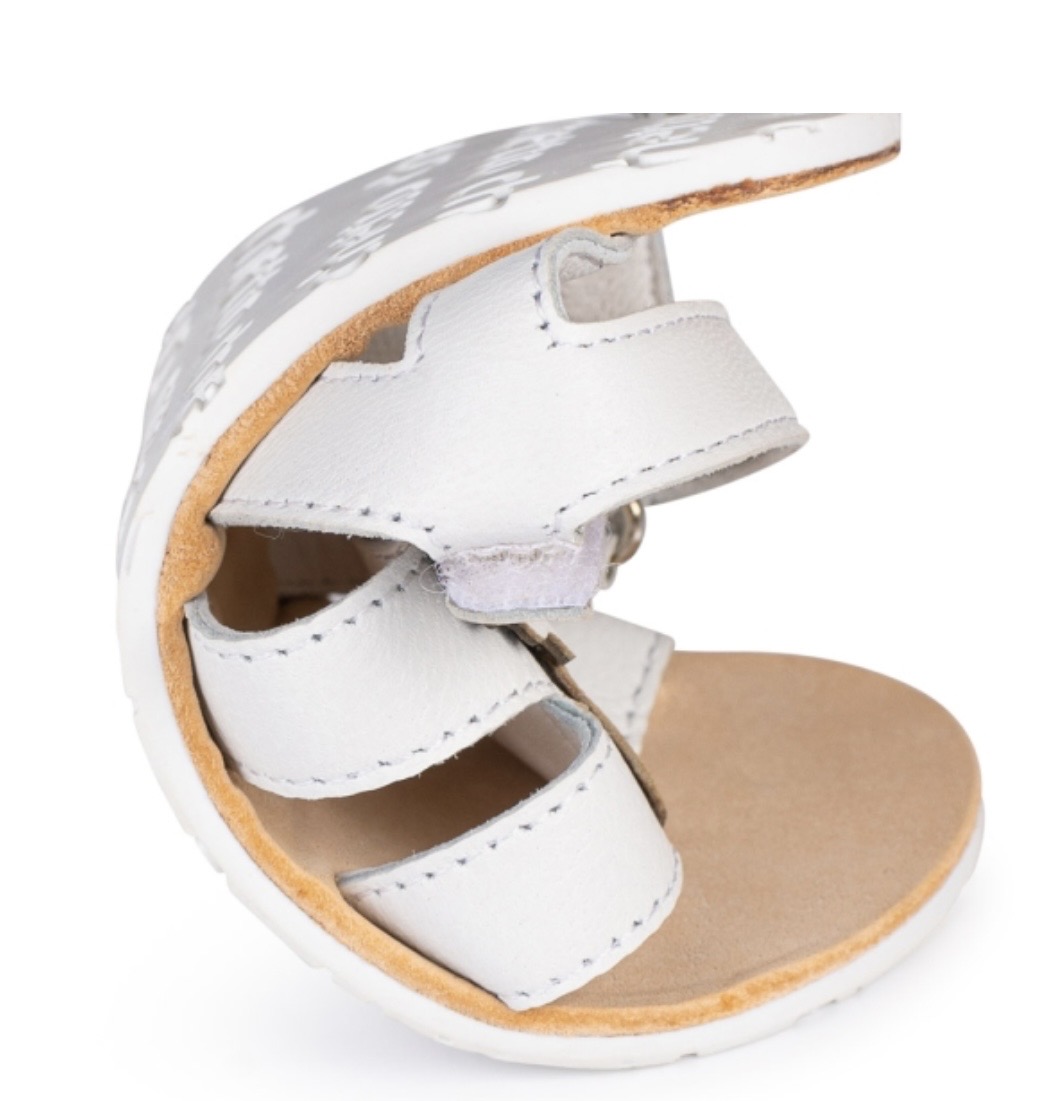 Sandalia de piel blanca , con horma barefoot y respetuoso, ajuste de velcro piso antideslizante .