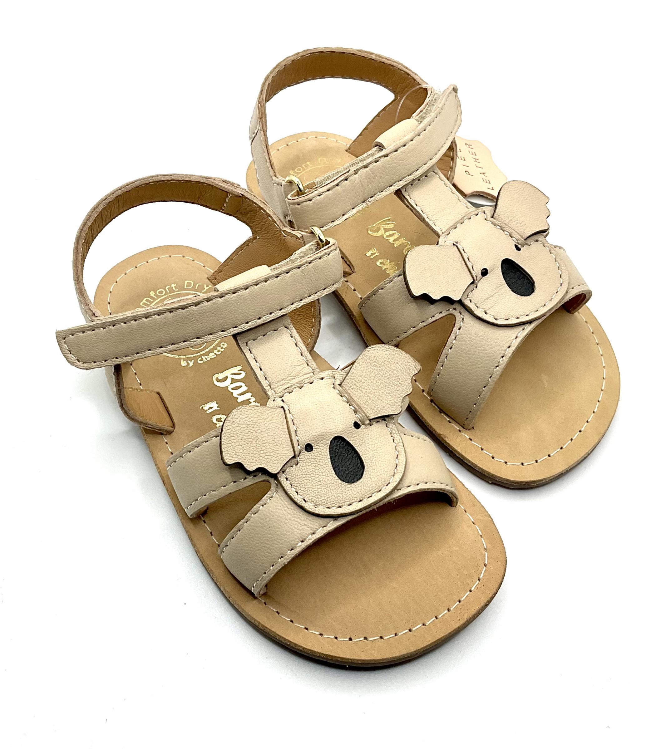 Sandalia de horma respetuosa y Barefoot fabricada en piel con una cabecita de koala en el empeine, es de color beis , se ajusta con cierre de Velcro y lleva el talón al aire ,es muy ligera y flexible.