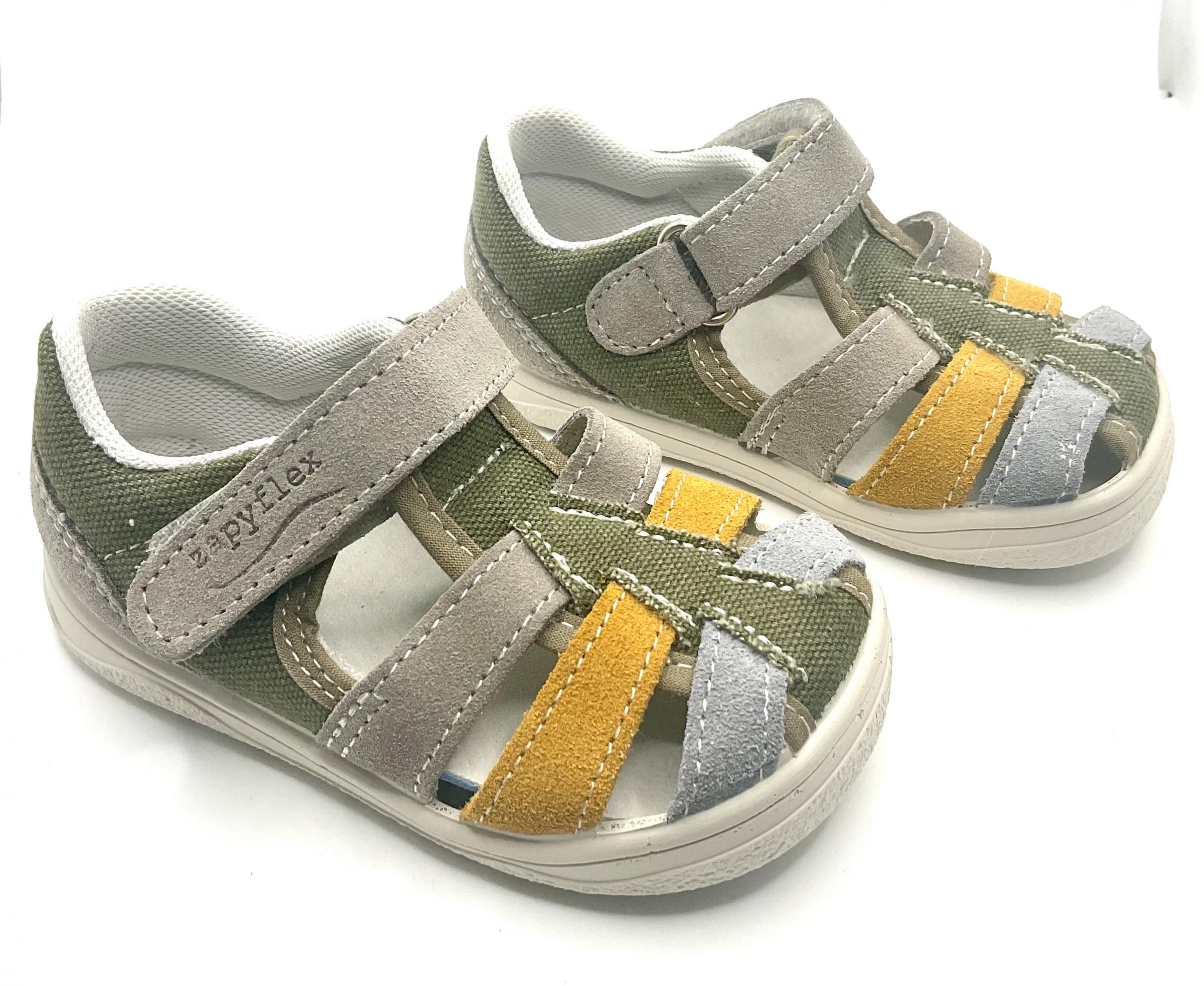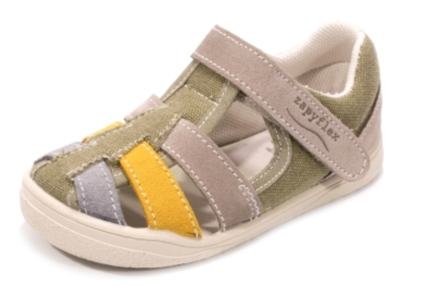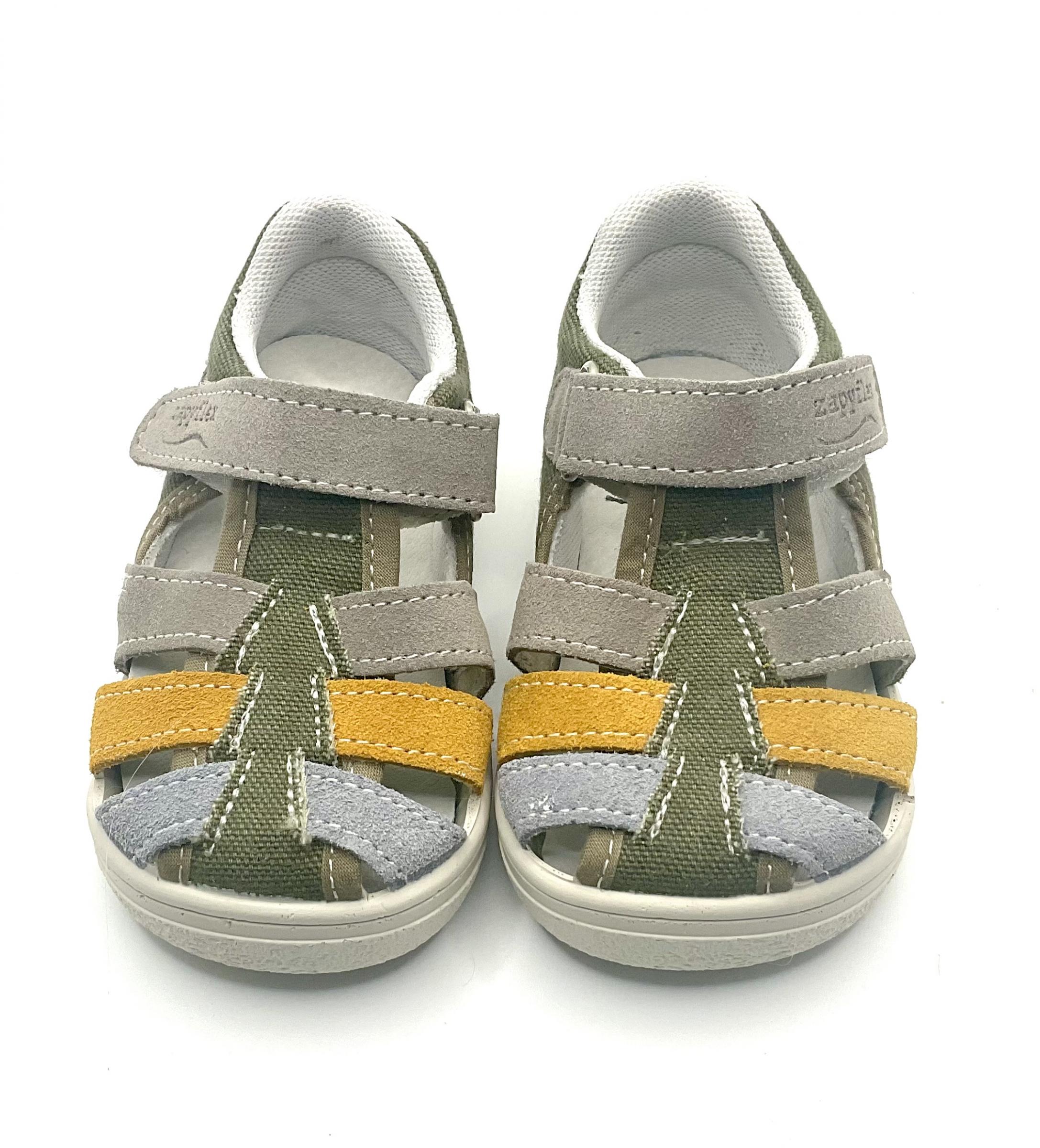 Sandalia de lona con horma completamente respetuosa, de la marca Zappy, con ajuste de Velcro, muy ligera y muy flexible. Combina el color piedra con el verde caqui, el celeste y el mostaza. Una bonita combinación muy veraniega, Son lavables en la lavadora.