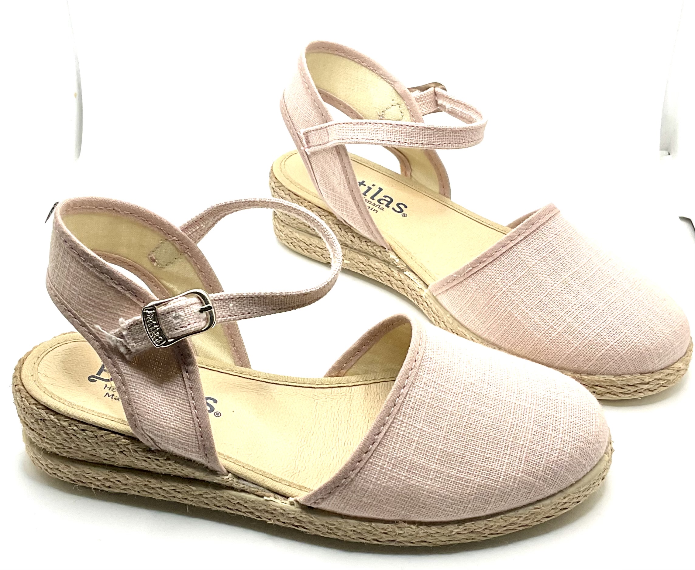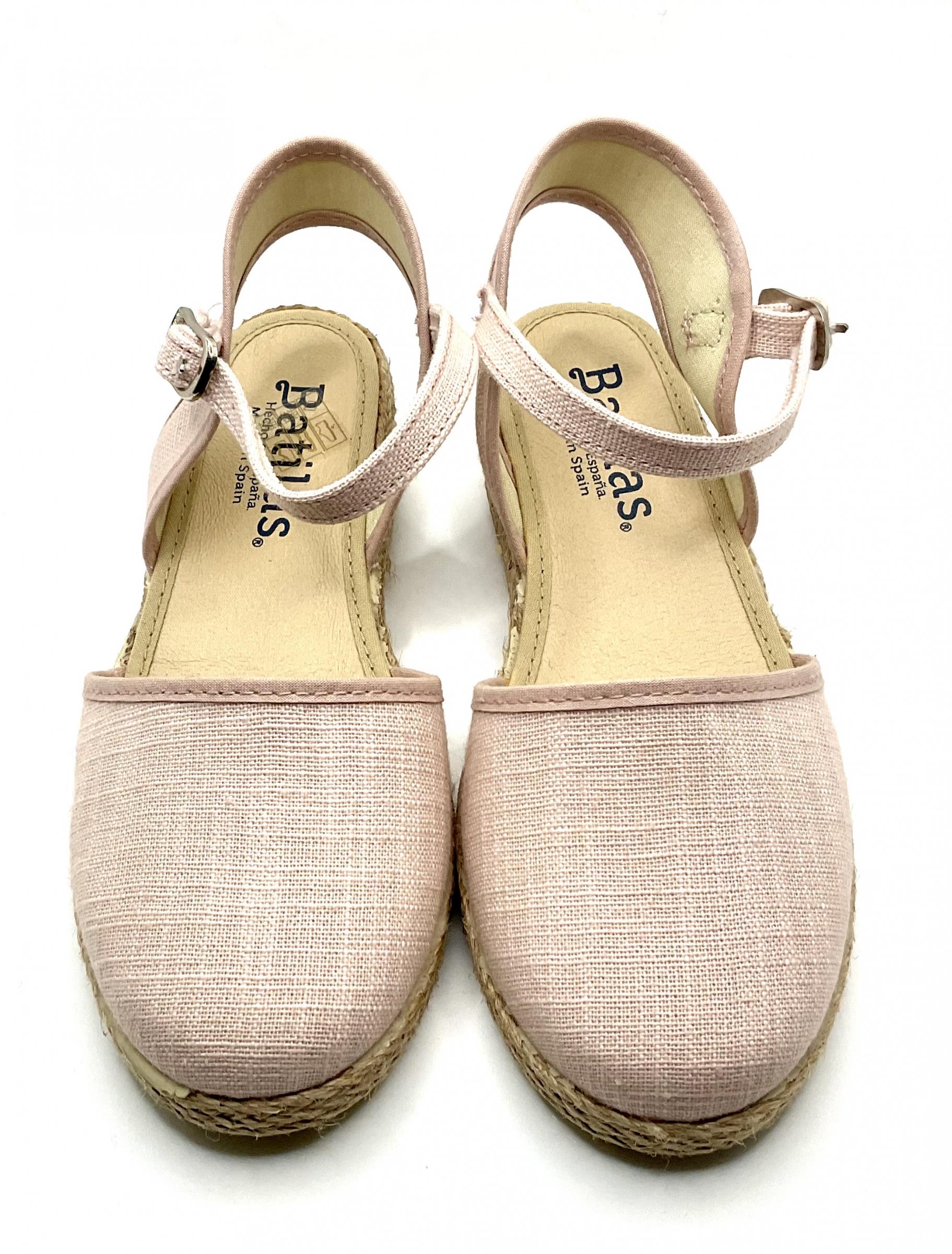 Valenciana de Esparto con cuña, fabricada en hilo de color rosa maquillaje por la marca Batilas, talón descubierto y ajuste con hebilla