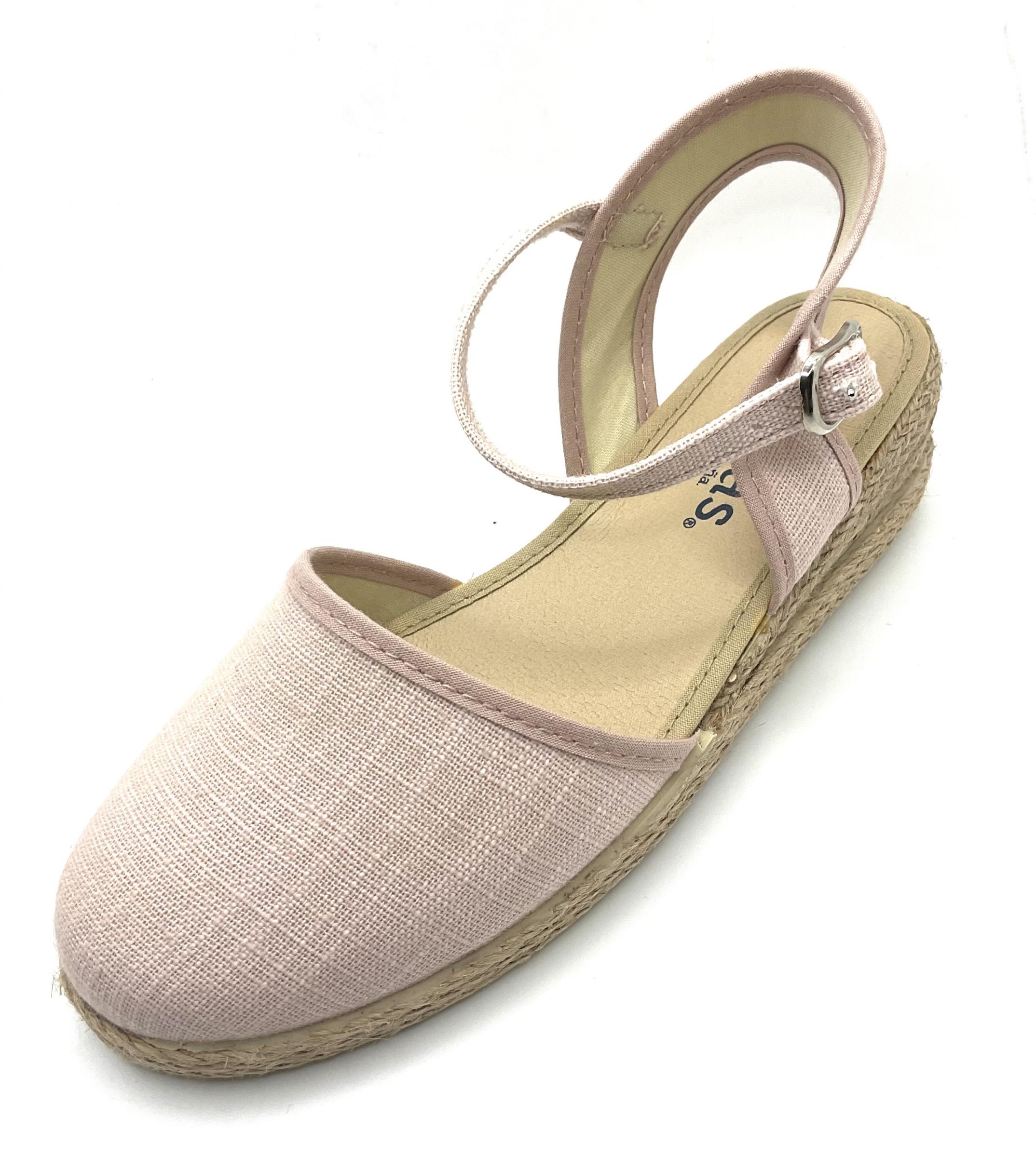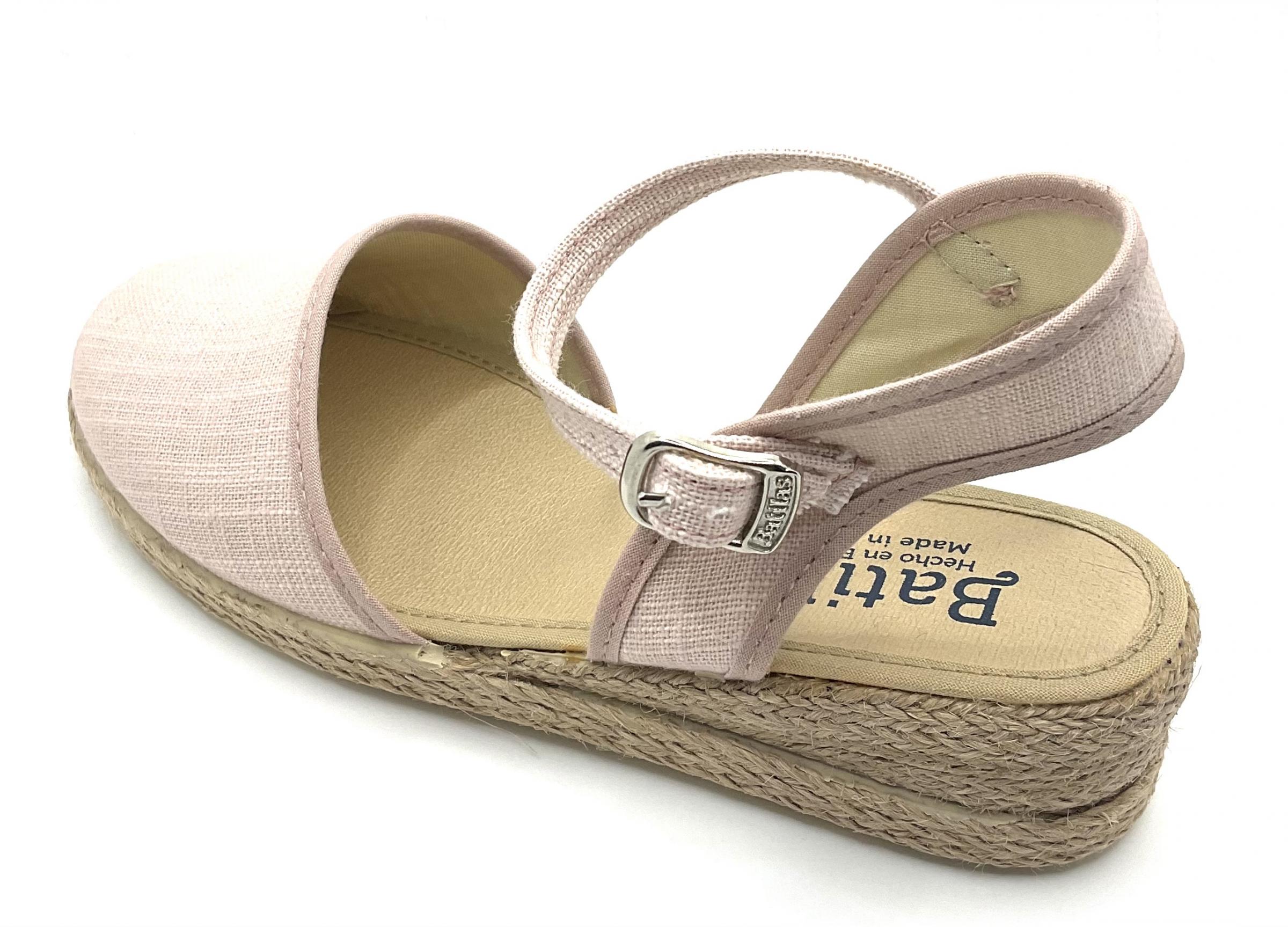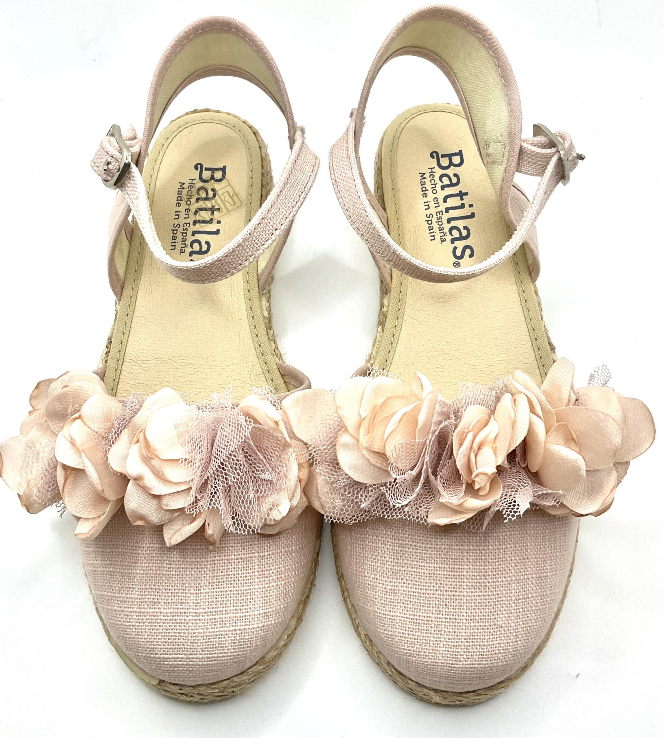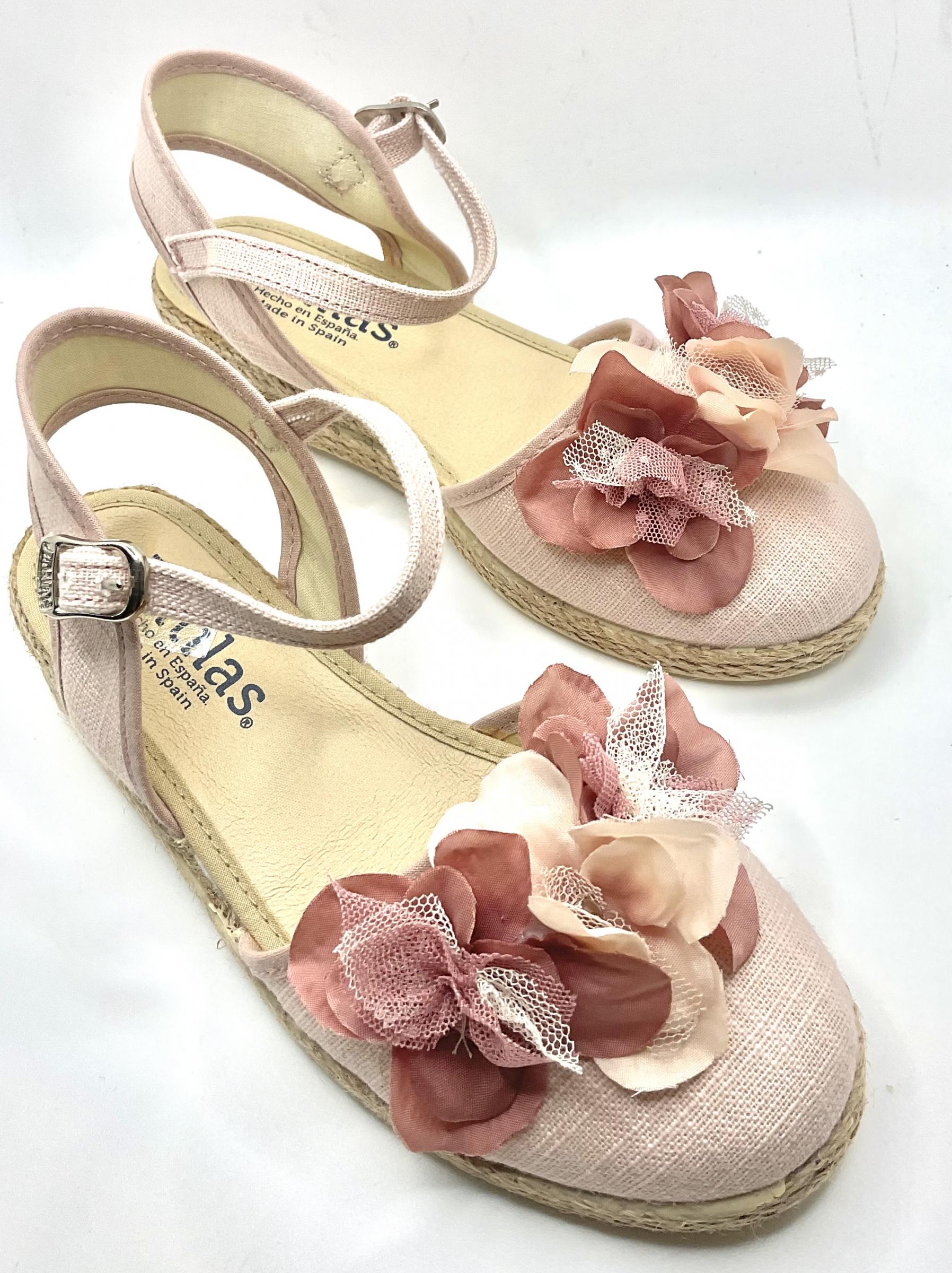 Valenciana con cuña ,cierre con hebilla de lino rosa .Puedes elegir un aplique floral y te quedará un espato ideal para primera comunión o bodas , no va pegado , sino cosido de manera que tras el evento puede ser aprovechado para múltiples ocasiones .
