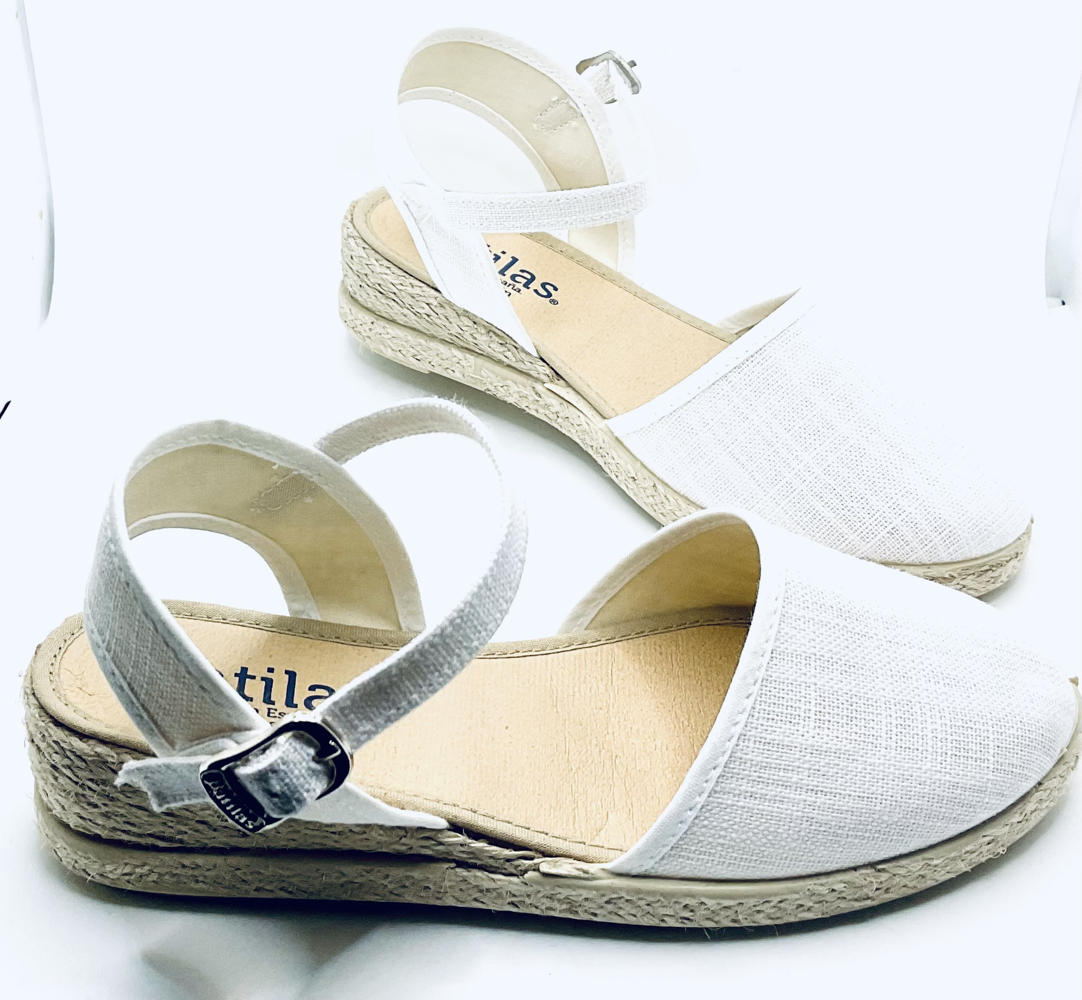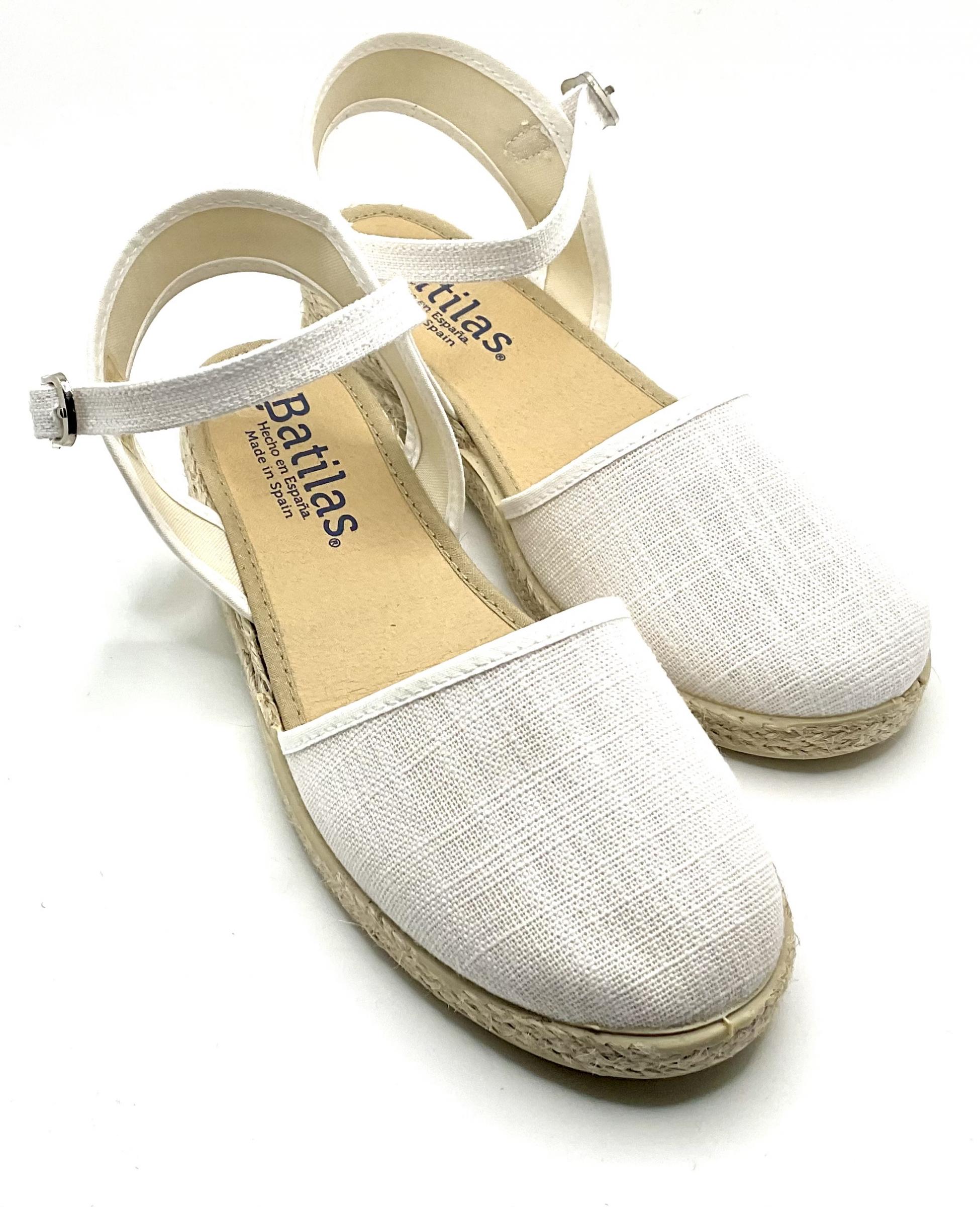 Valencianas de esparto con cuña, fabricada por la marca Batilas en hilo blanco, talón abierto y ajuste con hebilla