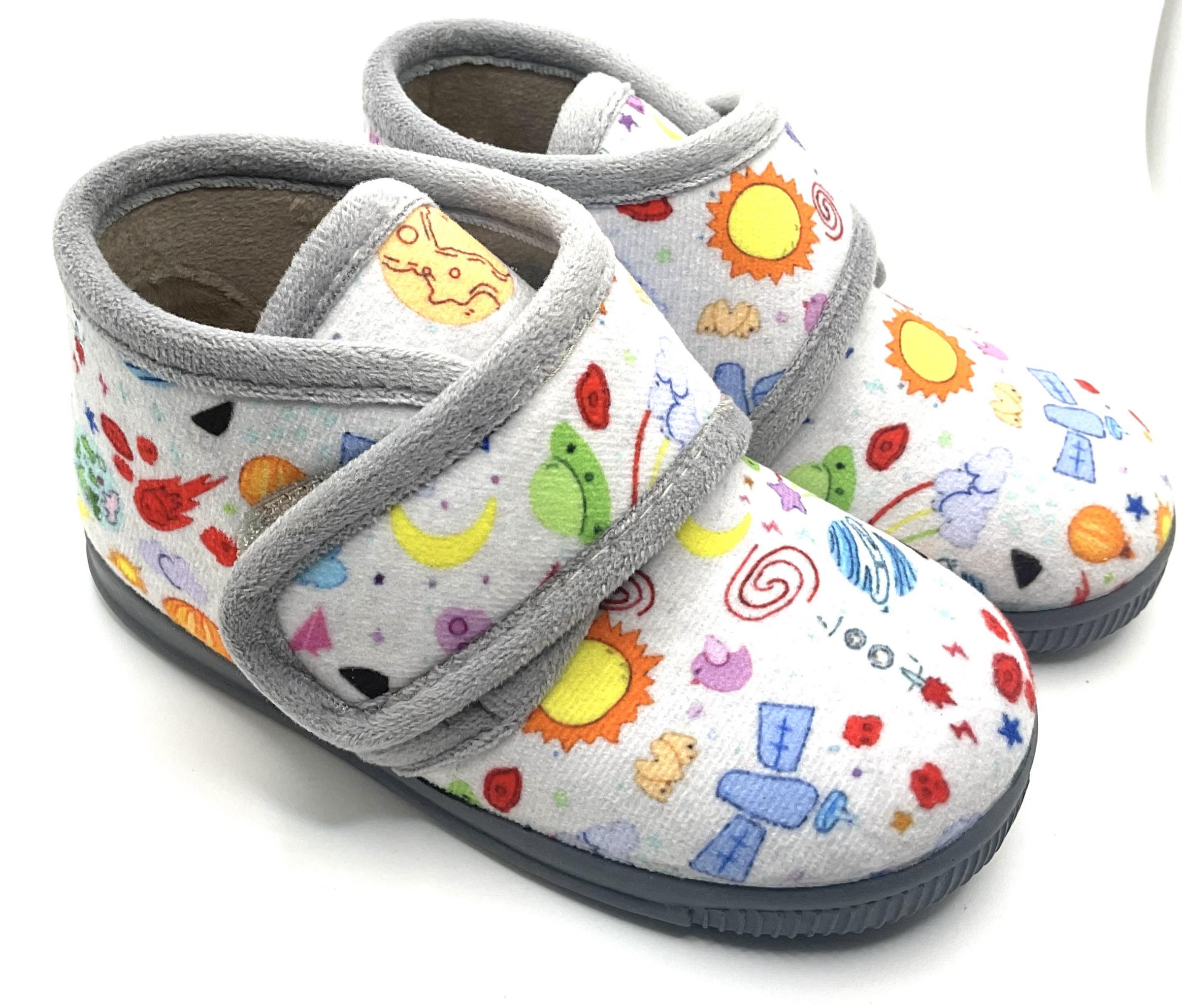 Zapatillas para estar en casa fabricadas con una Felpita muy suave, sin costuras internas, ni contrafuertes, ligeras y muy flexibles, con cierre en Velcro y un precioso dibujo de los planetas
